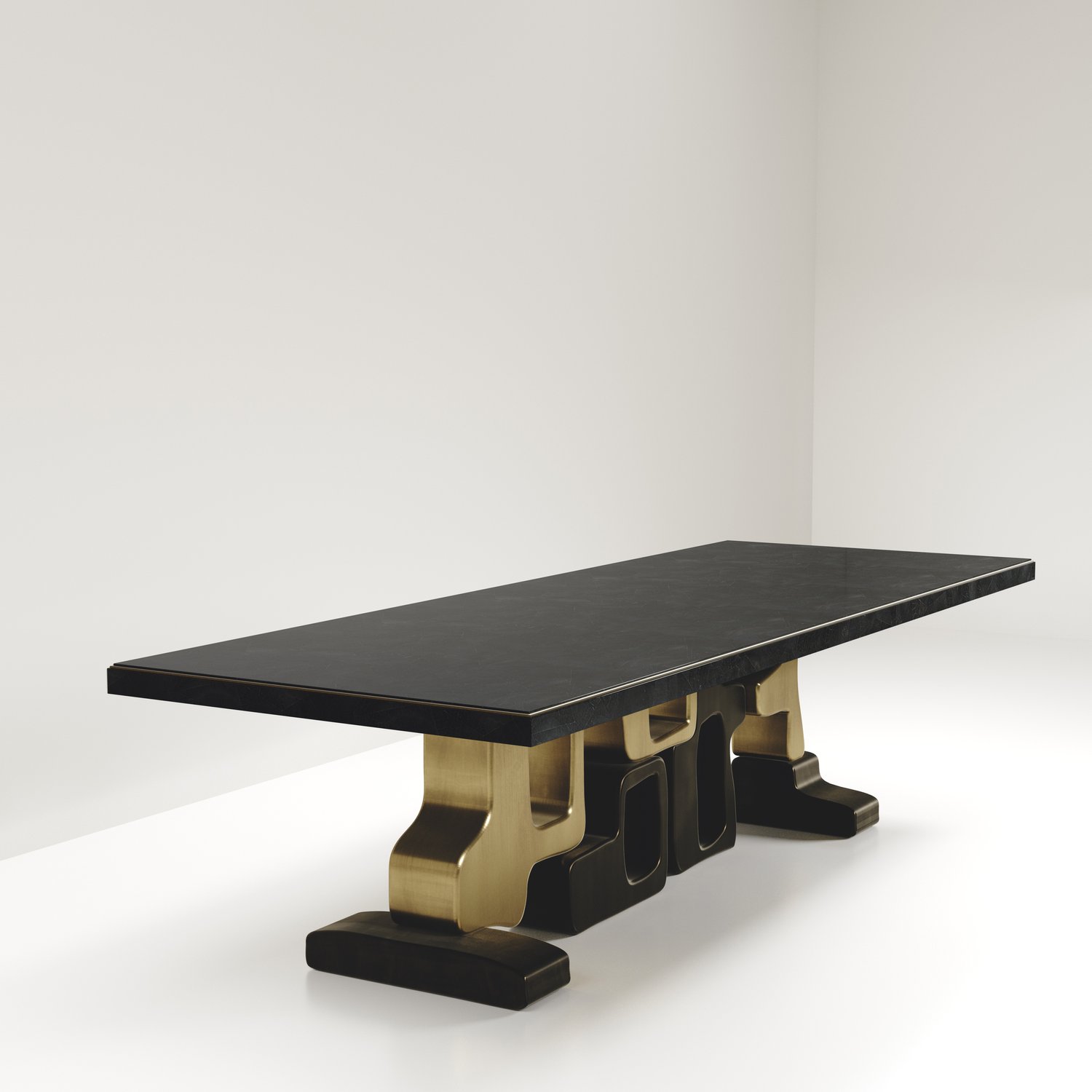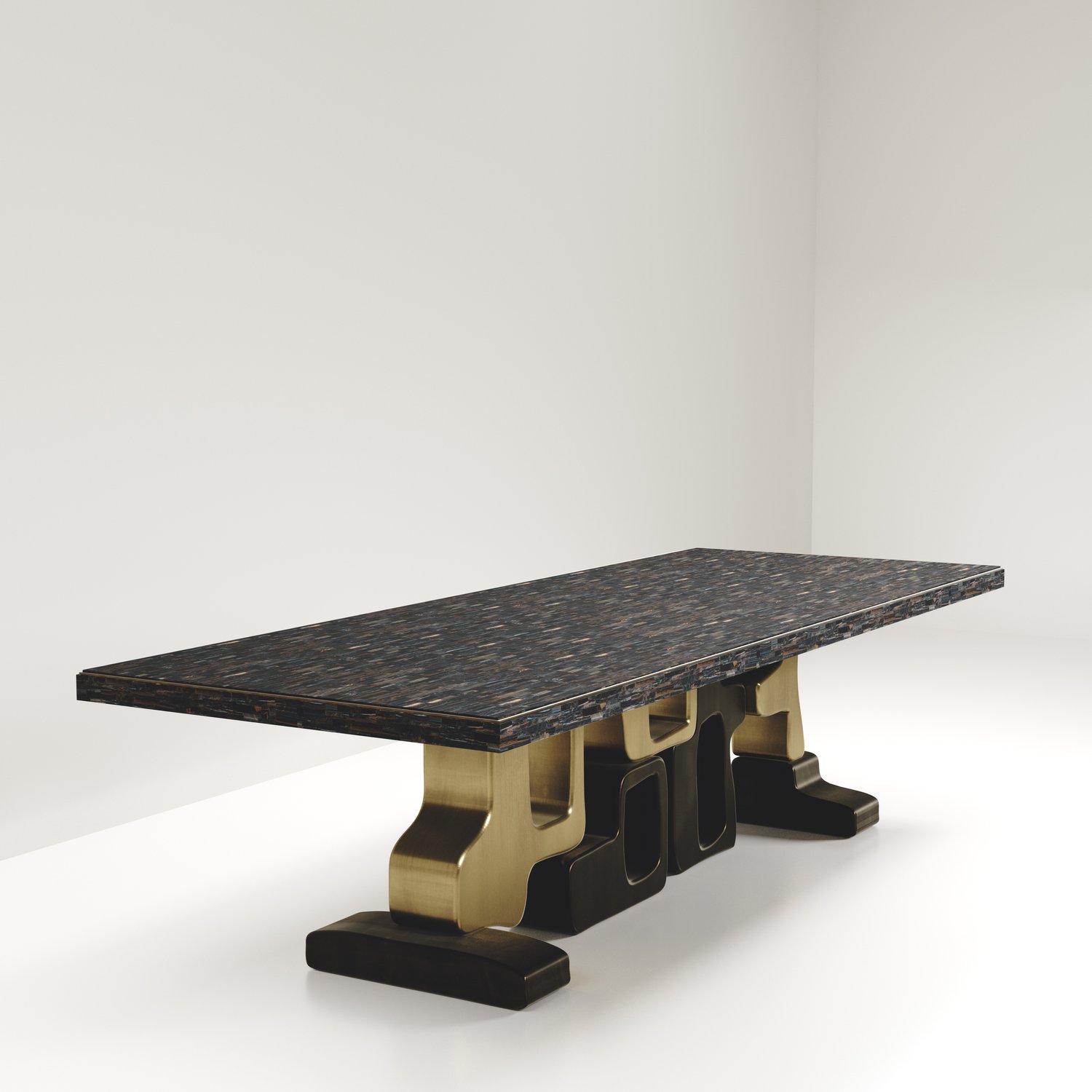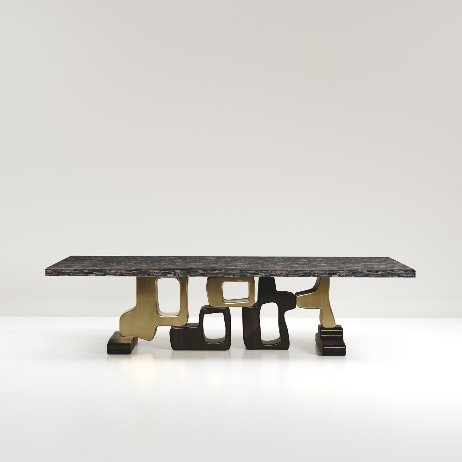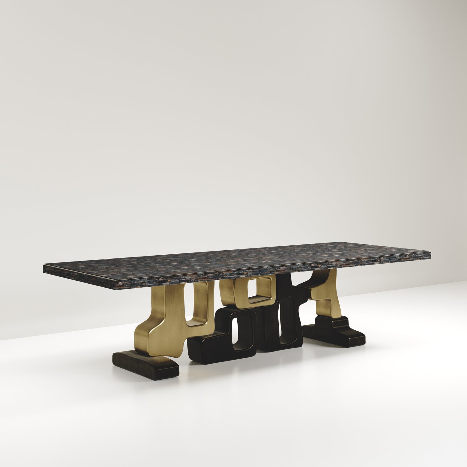 The Apoli II dining table by Kifu Paris is both dramatic and organic its unique design. The black pen shell inlaid top sits on a long clustered geometric and sculptural bronze-patina brass base. This piece is designed by Kifu Augousti the daughter of Ria and Yiouri Augousti. Part of the Apoli Capsule Series, see images of collection at end of slide.