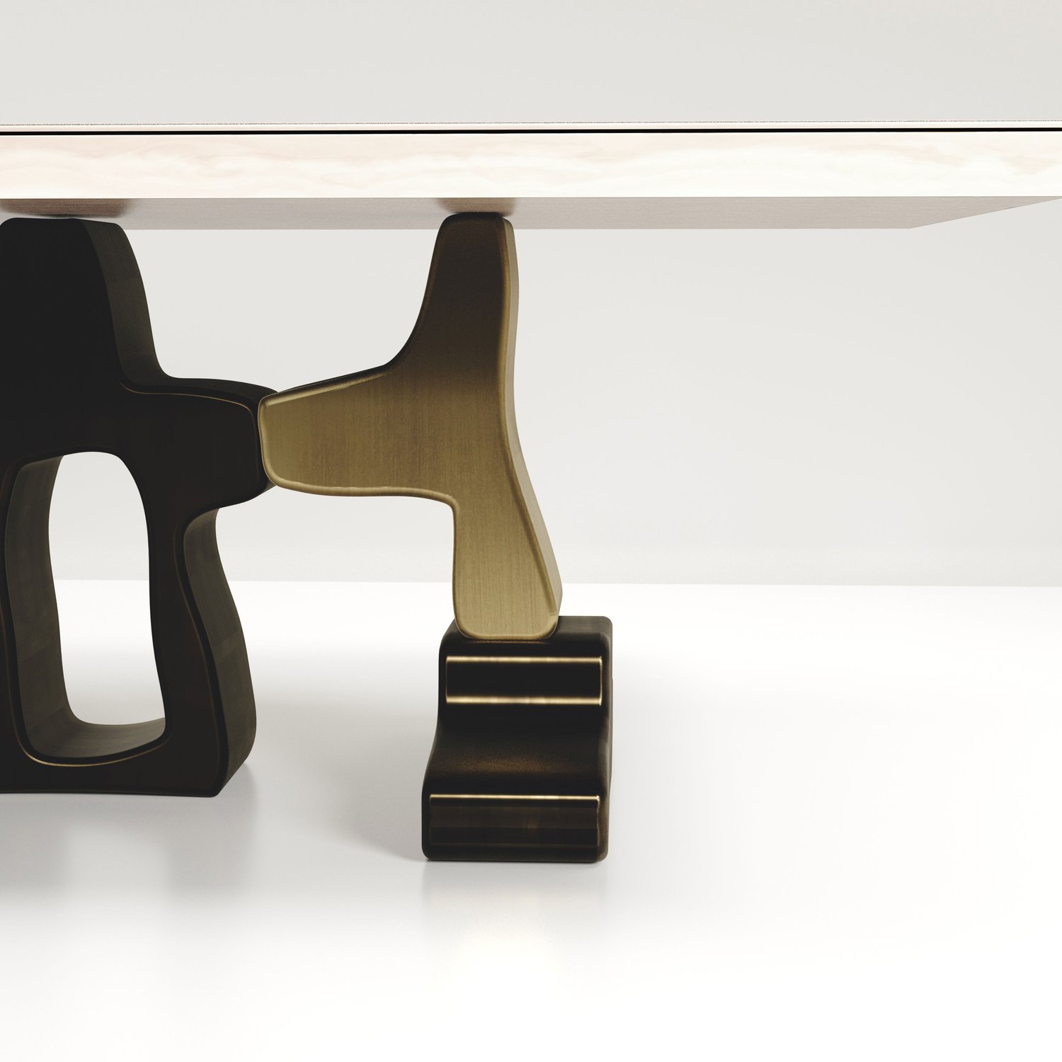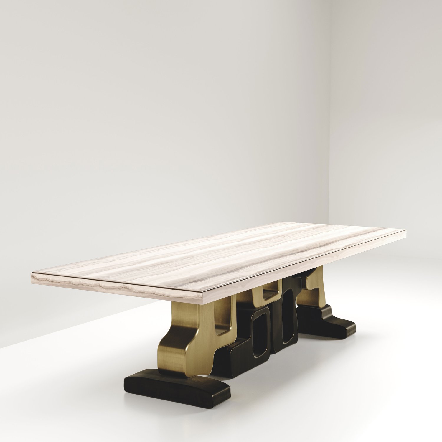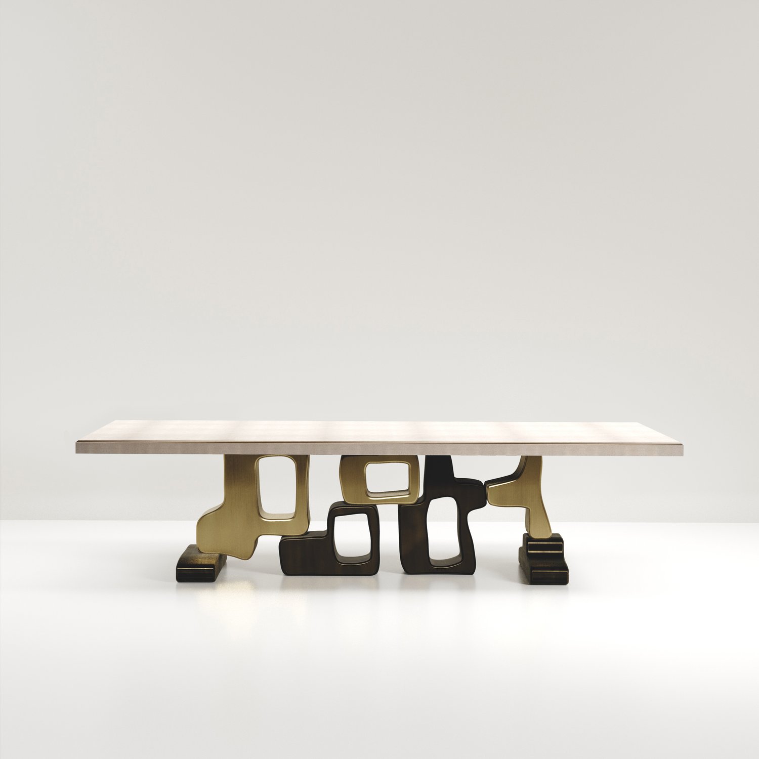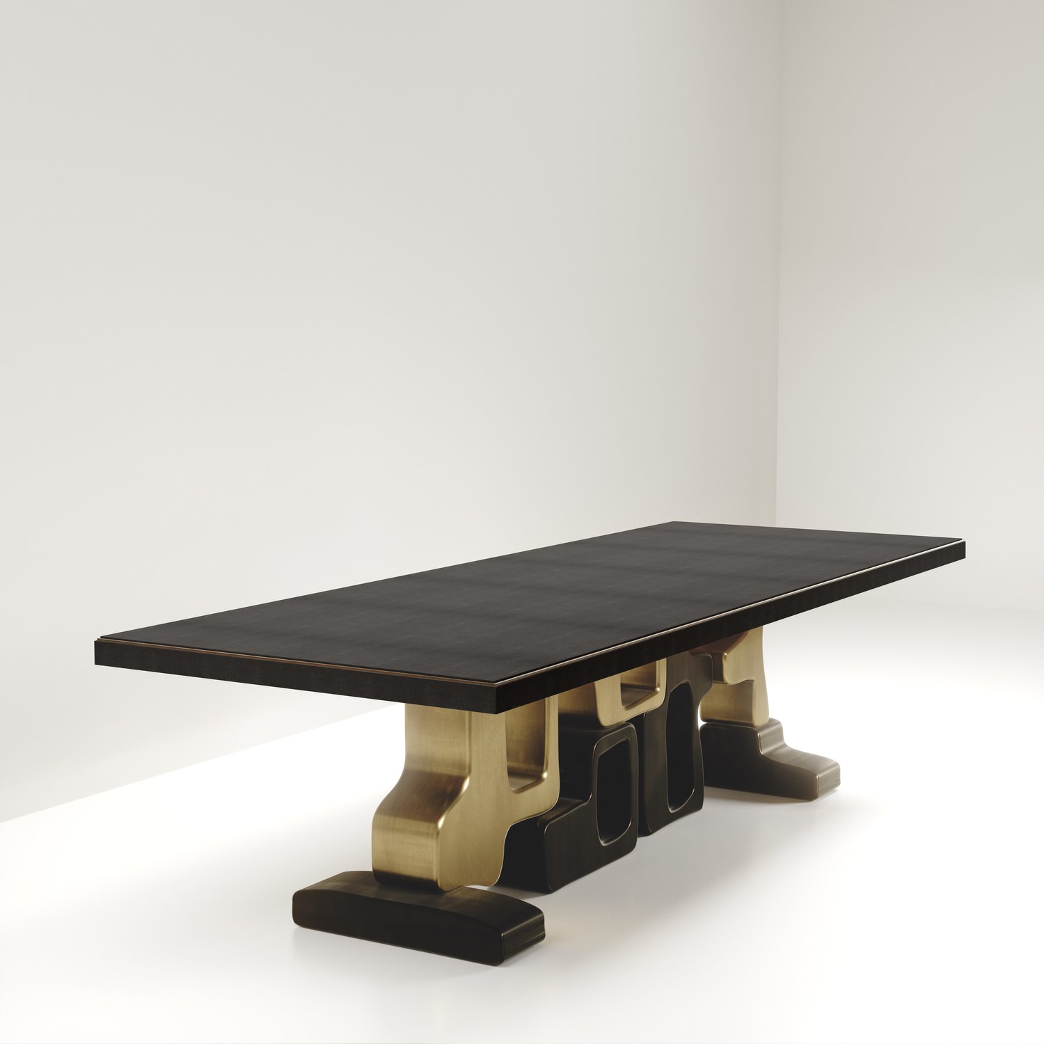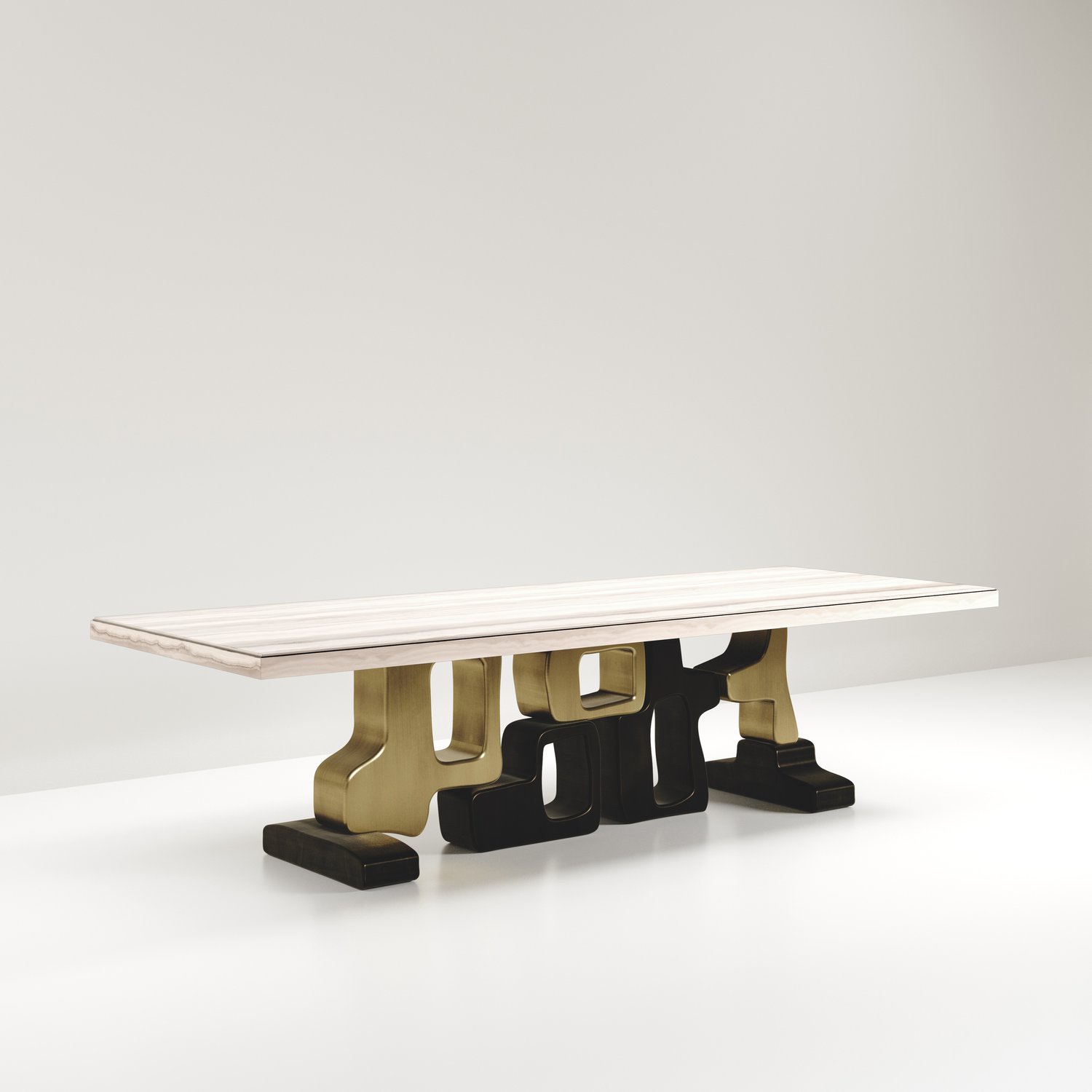 The Apoli II dining table by Kifu Paris is both dramatic and organic its unique design. The black pen shell inlaid top sits on a long clustered geometric and sculptural bronze-patina brass base. This piece is designed by Kifu Augousti the daughter of Ria and Yiouri Augousti. Part of the Apoli Capsule Series, see images of collection at end of slide.