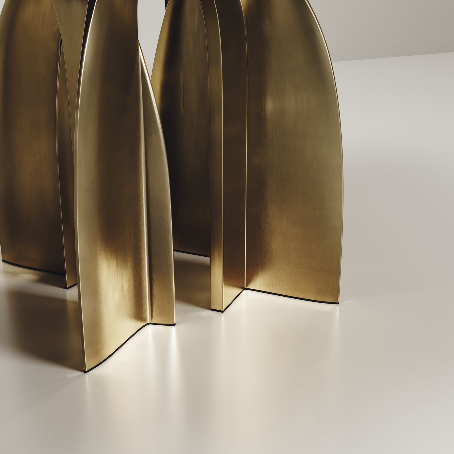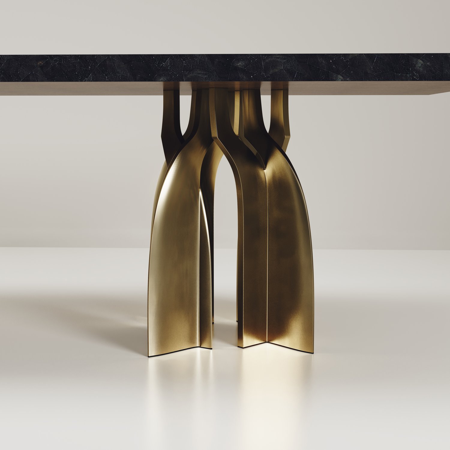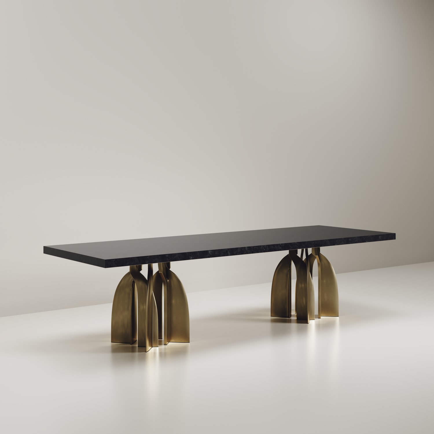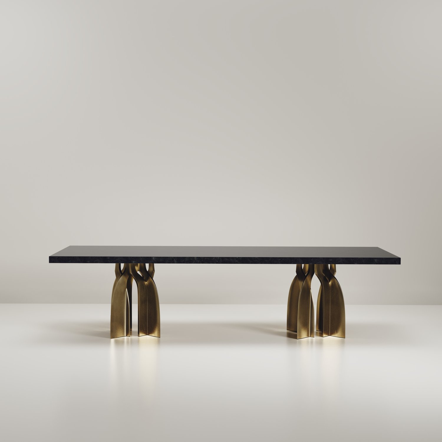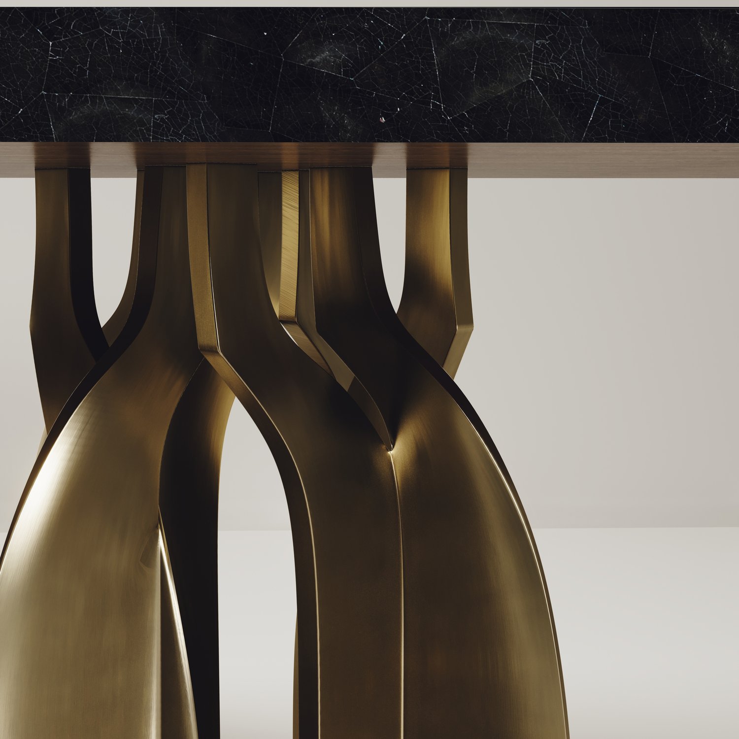 The Chital Dining table is a stunning piece, a statement in any space. The black pen shell inlaid top is sleek and dramatic, and followed by bronze-patina brass sculptural legs clustered together as the base. This piece is designed by Kifu Augousti, the daughter of Ria & Yiouri Augousti. Available in other finishes and as a round breakfast table version.