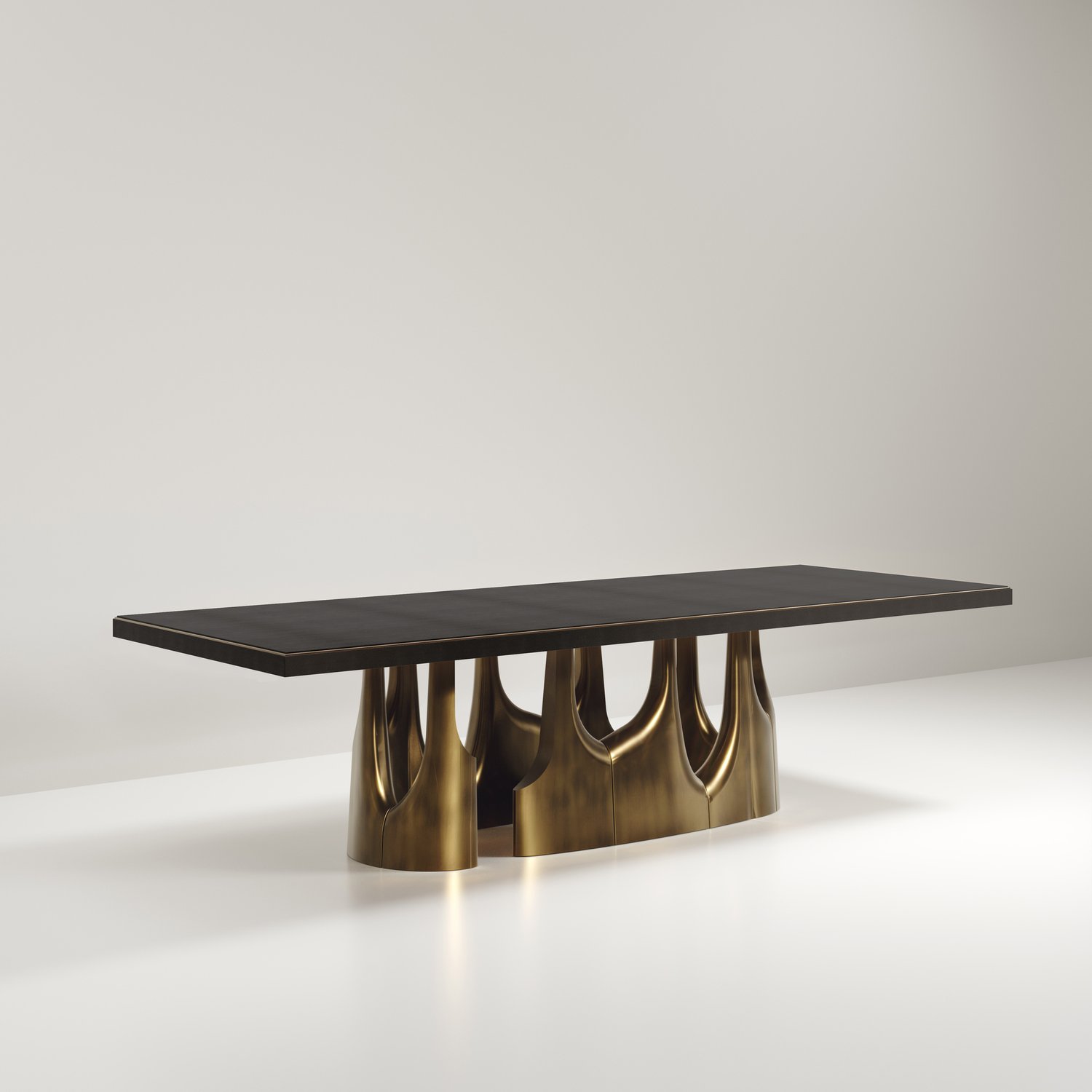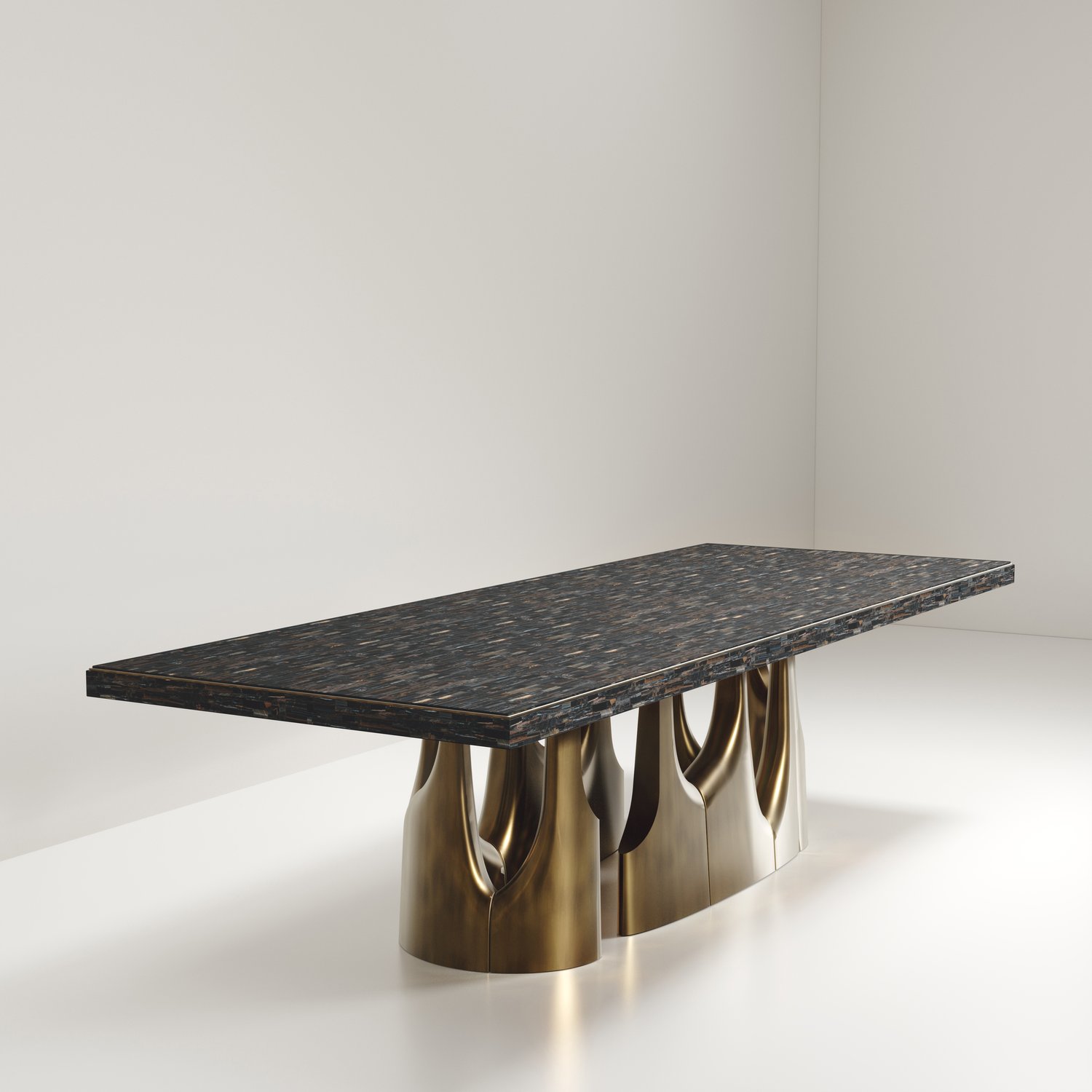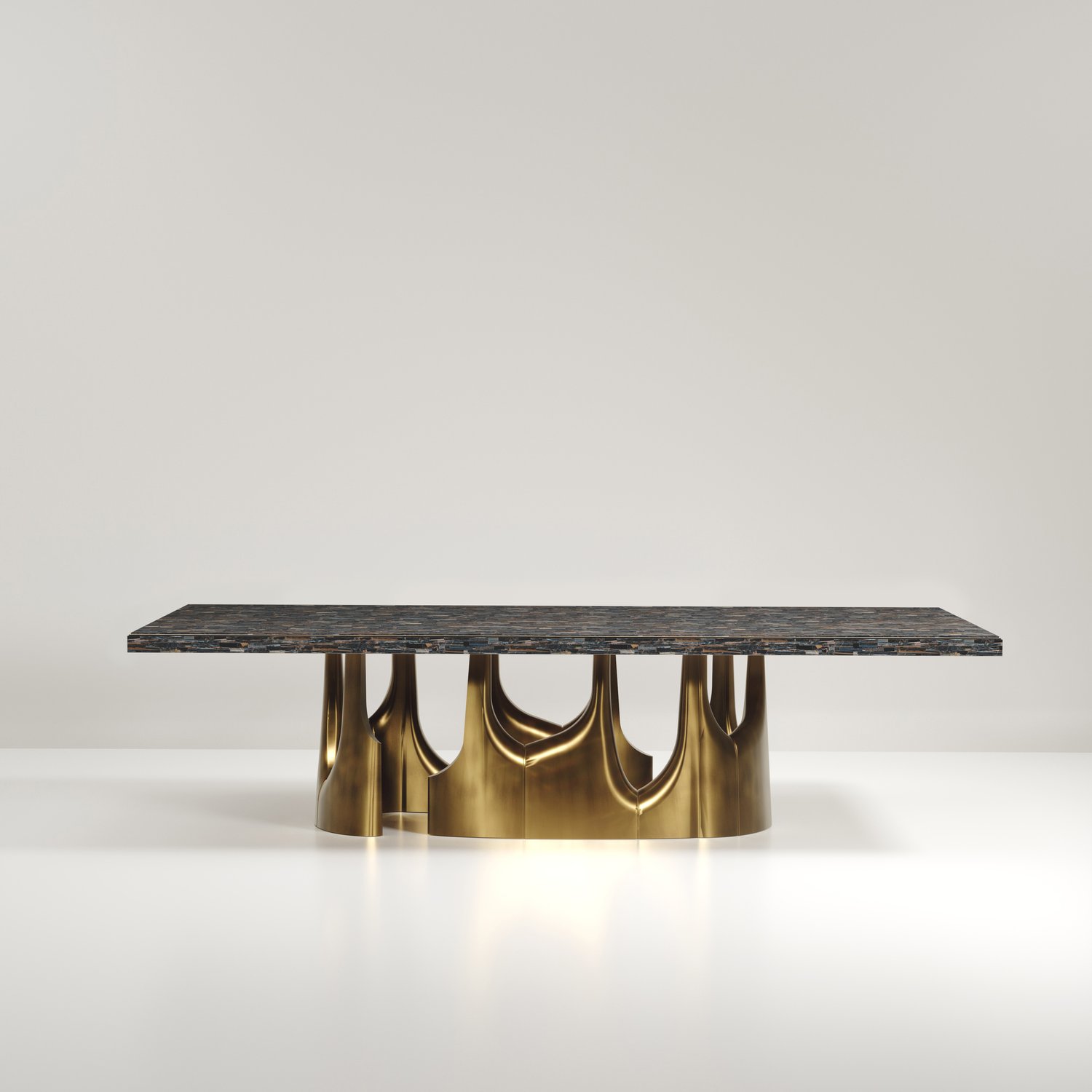 The Triptych II Dining Table by R&Y Augousti is a stunning multi-faceted sculptural piece. The beautiful hand craved details on the long clustered bronze-patina base demonstrate the incredible artisan work of Augousti. The top is in an incredible semi precious blue tiger eye stone. Available in other finishes and other variations.