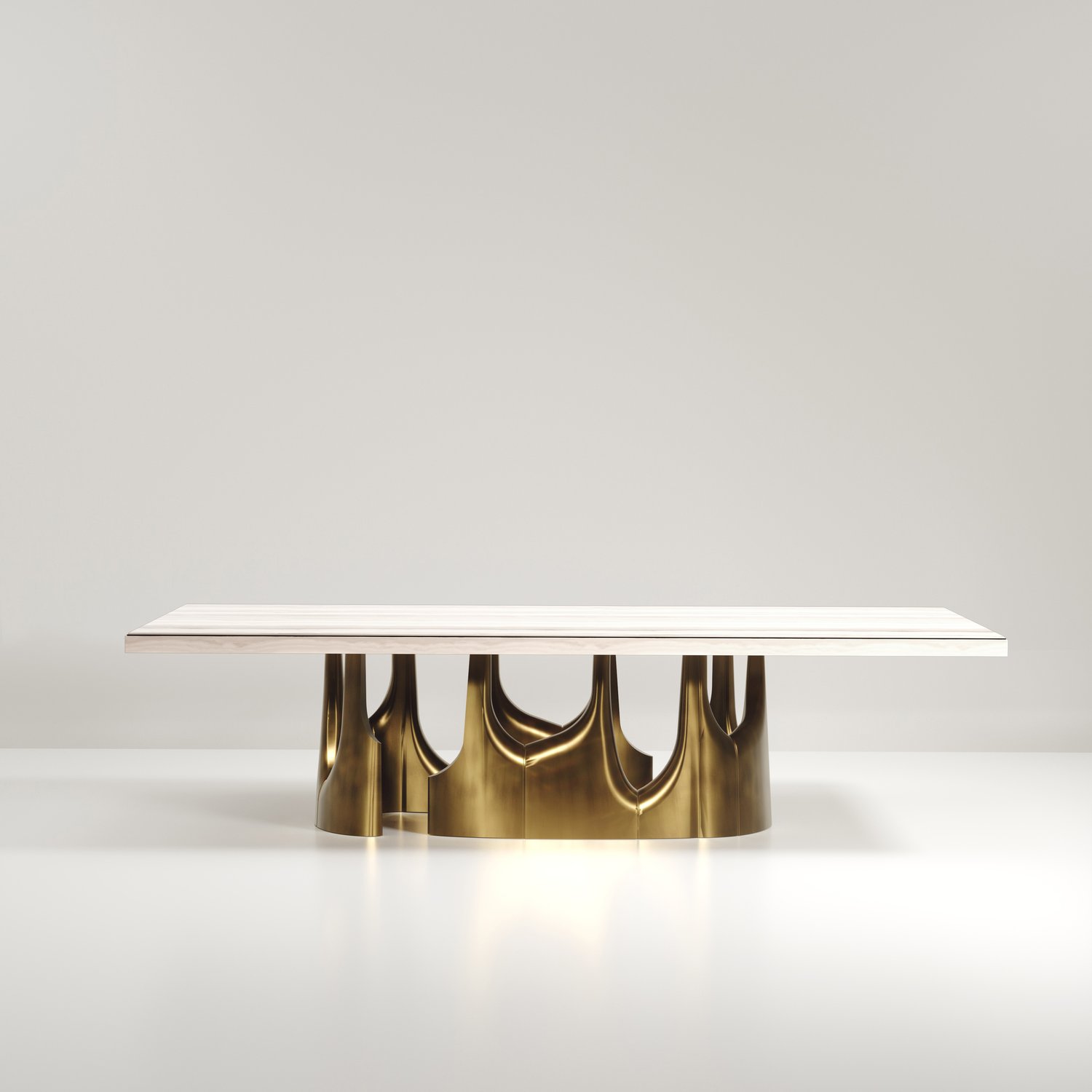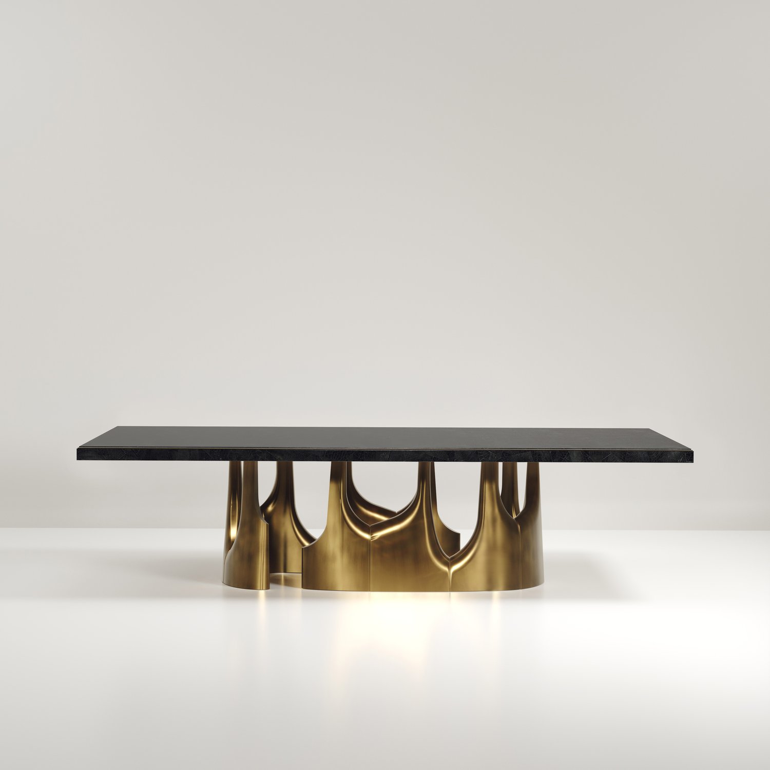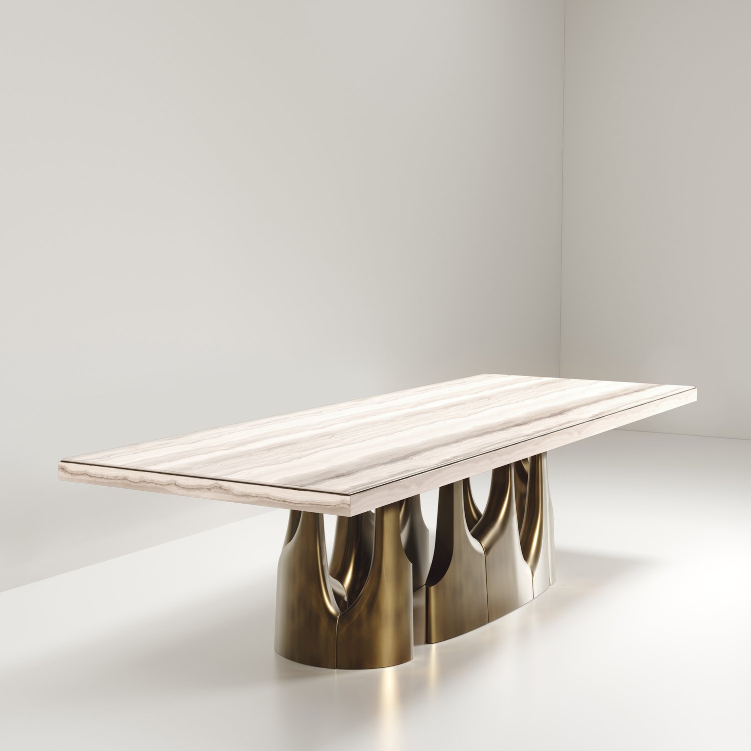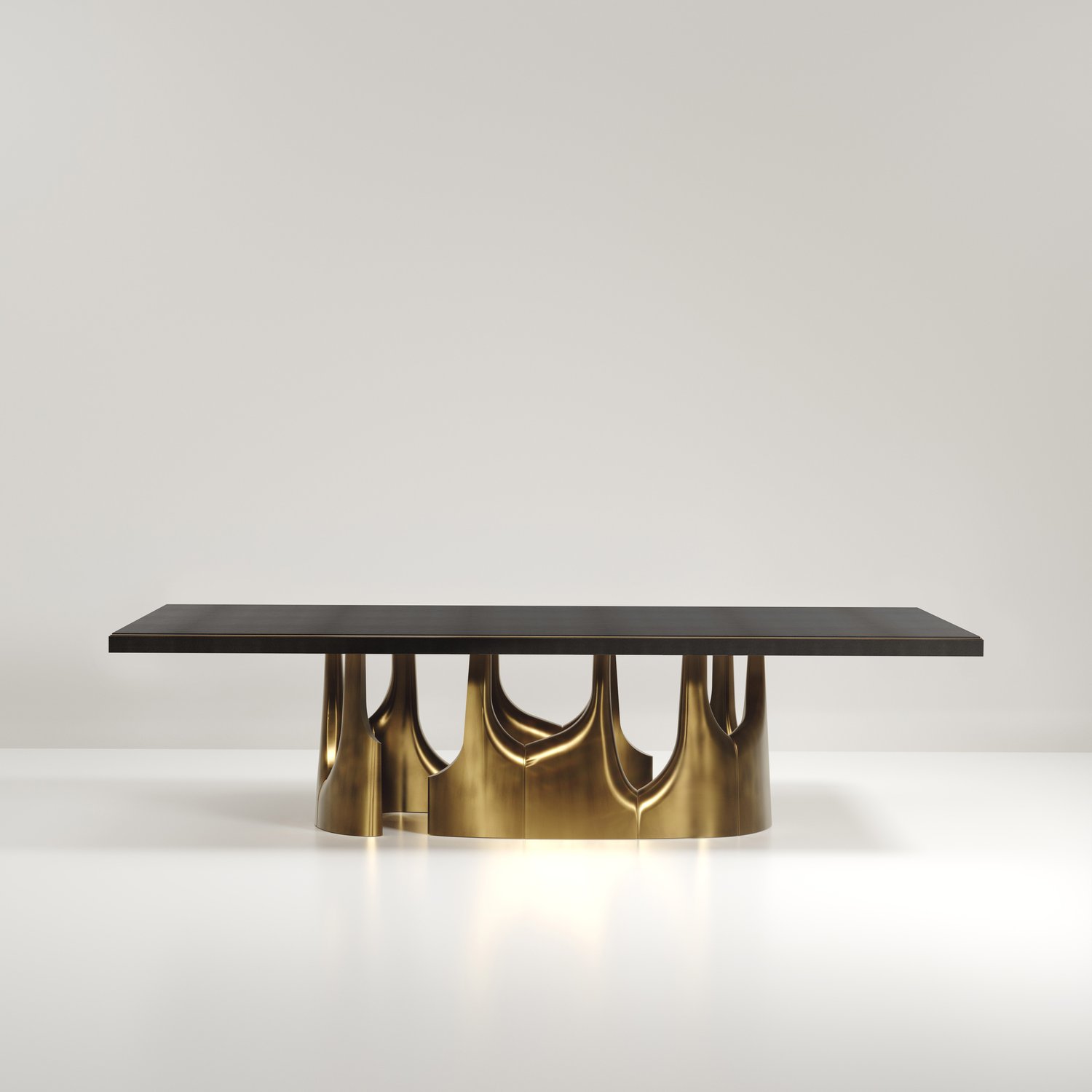 The Triptych II Dining Table by R&Y Augousti is a stunning multi-faceted sculptural piece. The beautiful hand craved details on the long clustered bronze-patina base demonstrate the incredible artisan work of Augousti. The top is in an incredible semi precious blue tiger eye stone. Available in other finishes and other variations.