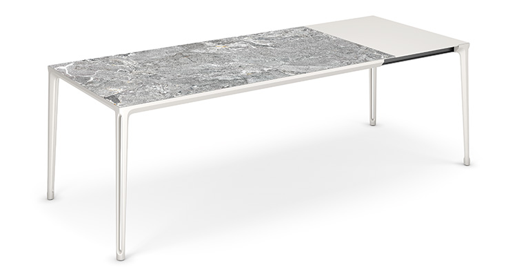 Boulevard is a design dining table with a disarming simplicity. It fits into a residential setting with ease and contemporary charm. The legs have a vertical cavity, enhanced by sophisticated varnished finishes chosen from among different intense or bright shades. The same finish rigorously frames the top, available in glass or ceramic.