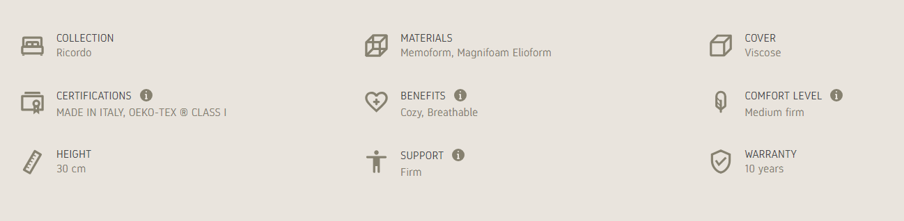 Ricordo 12 of the Ricordo collection is the ideal mattress for anyone who wants a firm but comfortable and cozy support to their back, thanks to the Memoform contained in the padding. All in 30 cm of height.