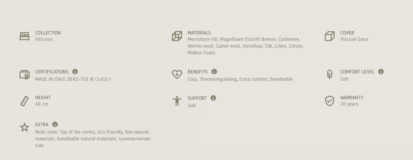 Virtuoso 16 of the Virtuoso collection is simply the best a mattress you can find. The mattress is made of fine materials, elegant fabrics and unique natural fibers. The high-density inner layers provide an exclusive comfort and soft support. All at 40 cm of height.
