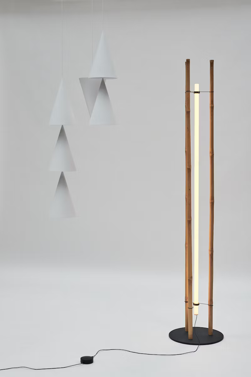 This family of floor lamps proposes an interchangeable lighting solution attached to a marble block. The exercise is an attempt to provide minimal support for the linear lighting elements through the simple gesture of touching the marble base with an invisible magnetic connection. The result is a distilled composition of basic elements.