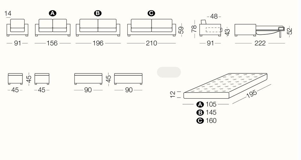 Garrison-2 has a particular removable cover and features feather seat and back cushions with polyurethane inserts and feet in black chrome finish upon request. Garrison-2 turns into bed with a 195 cm. long mattress and is also available in all sizes in fixed version.