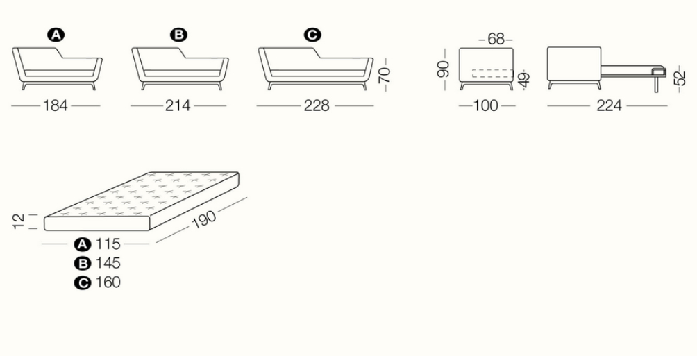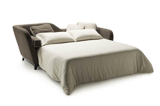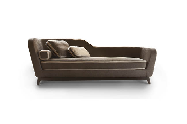 With its unique daybed shape, Jeremie recalls the Art Deco style, emphasized by its three variants: “Trendy”, turquoise fabric with special white details and orange base, “Fashion”, in shades of deep pink with floral patterns, striped details and green base, “Glamour”, in elegant taupe and brown colours. Featuring a seat in feather and high resilient polyurethane foam, feather backrest pillows and solid beech wood base in standard wenge finish or RAL color on demand, Jeremie is available in three widths, 184, 214 cm and 228 cm and in several contemporary or classic fabrics. Jeremie is also available in bed version with a 190 cm long mattress.