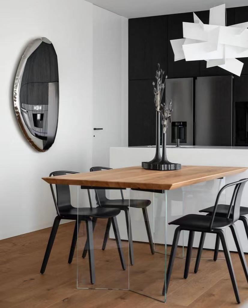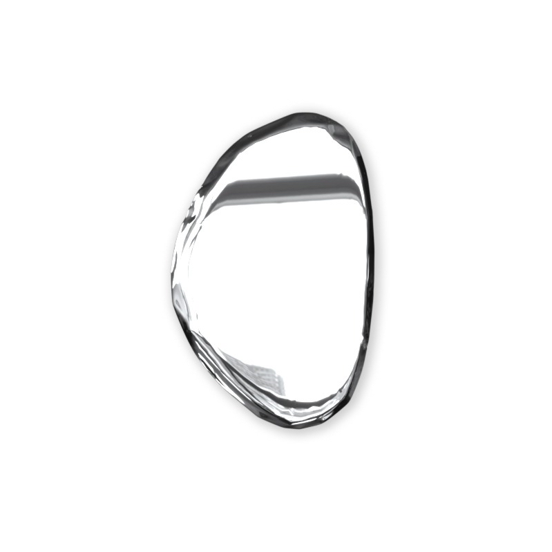TAFLA O is a series of bionic mirrors of organic shapes inspired by natural shapes of liquid drops. Mirrors from the TAFLA collection are made of stainless steel polished to a high gloss and come in seven different sizes. They can be arranged in an artistic personalized composition or exposed on a wall as a single sculpture-like mirror. They will fit contemporary private spaces, as well as restaurants, bars and hotel rooms. You can enjoy the charm of the classic Inox finish or a colour selected from the available palette. The TAFLA O mirror looks mesmerizing as a single object, but also in layouts that make up constellations of them.