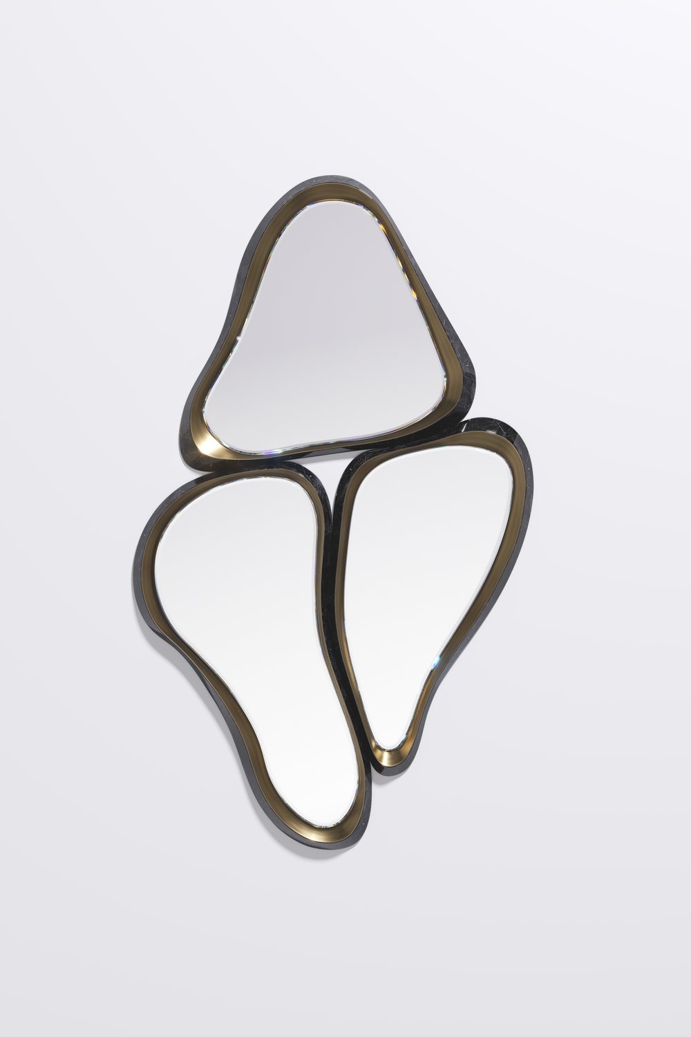 The Mask mirror is a statement and versatile piece. The 3 piece amorphous mirror melt into one another to create a fluid and dramatic expression. The frame is inlaid in either shagreen or pen shell with bronze-patina brass.This piece is designed by Kifu Augousti, the daughter of Ria and Yiouri Augousti.