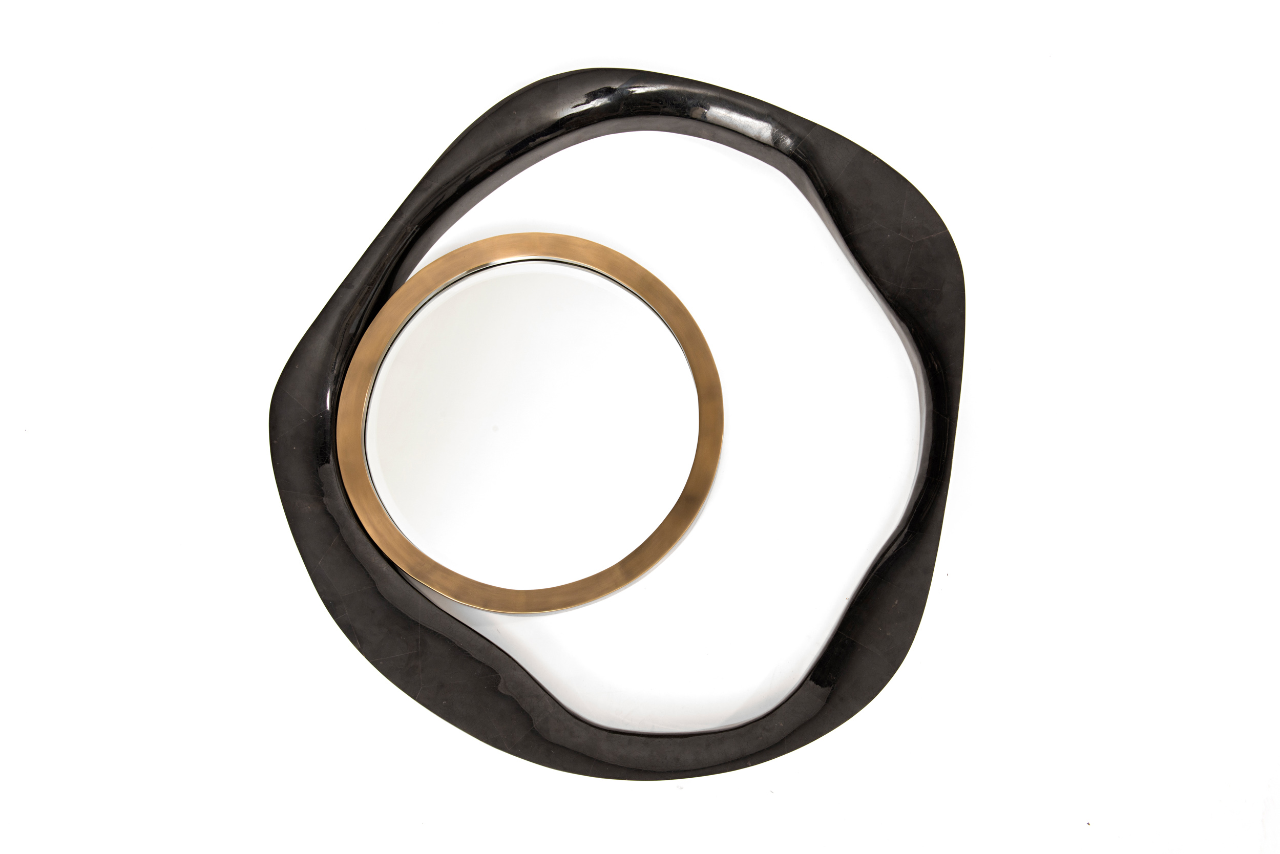 The Lily Mirror L became instantly an iconic piece of the R&Y Augousti Collection. With it’s poetic shape, the black pen shell creates dreamy tonalities. This mirror can be hung 3 different ways.