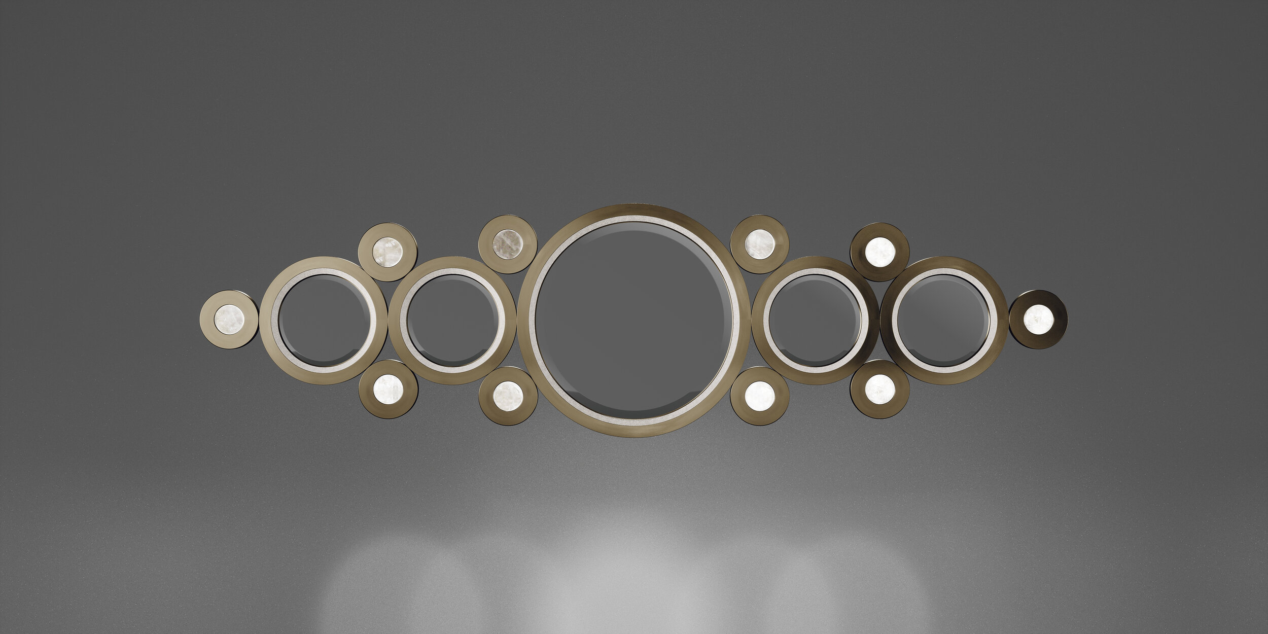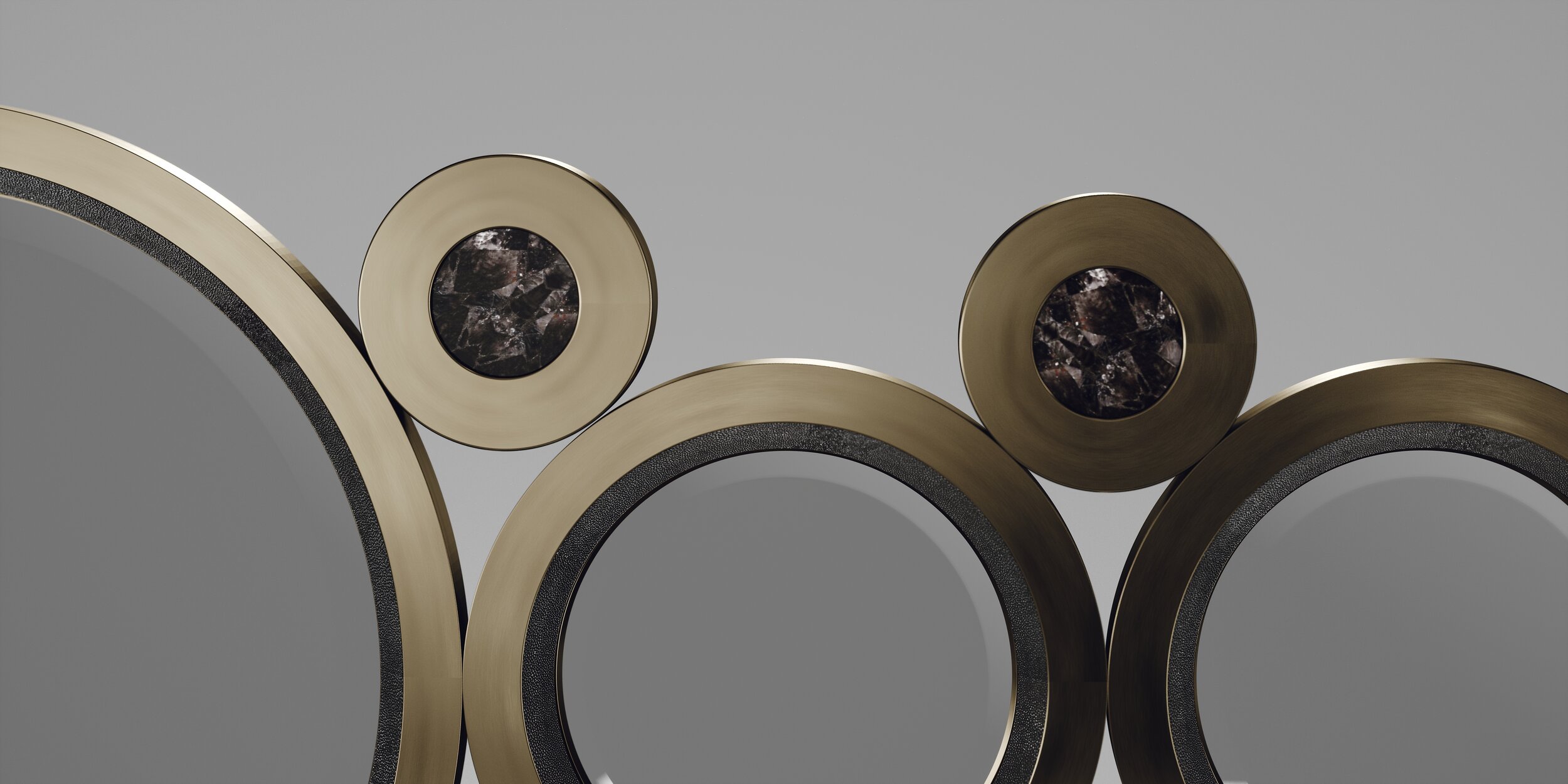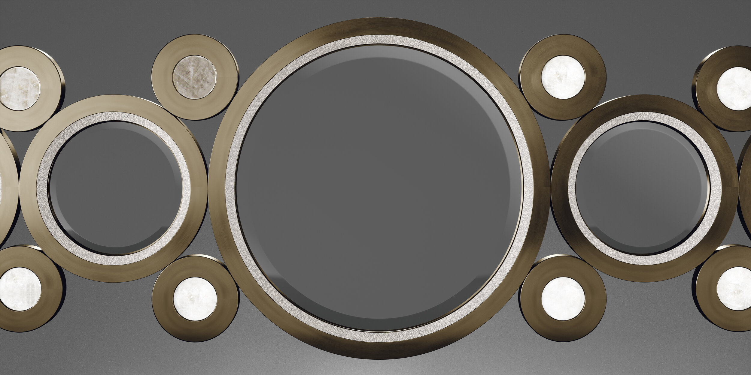 The circle mirror by R&Y Augousti in cream shagreen, white quartz and dark bronze-patina brass, is an archive piece of theirs from the 1990s. The statement wall piece adds drama and flair to any space and shows the richness of their incredible artisan work. This mirror can be hung on the horizontal or the vertical. Available in other finishes.