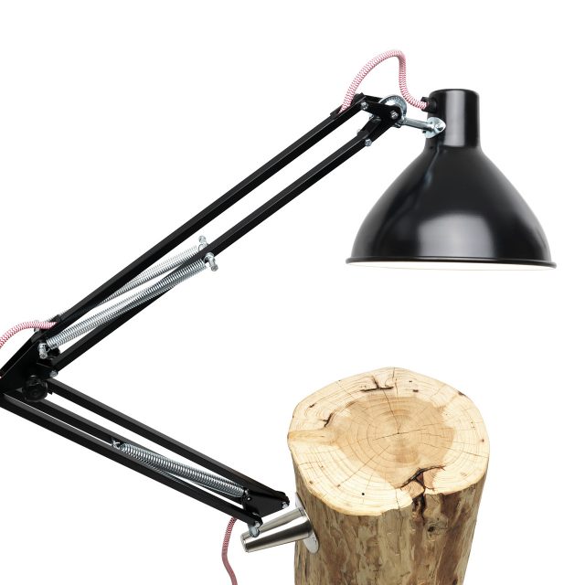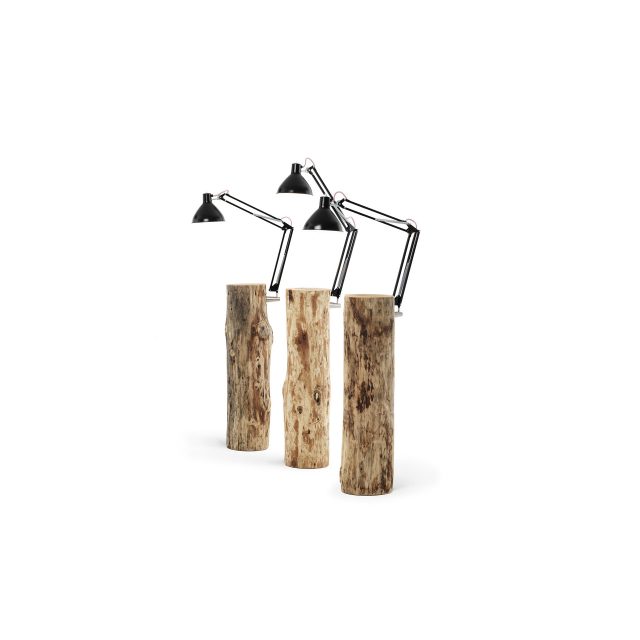 Piantama is a side table | lamp in solid wood complete with pantograph lamp available in white or black. Piantama is a successful combination of a natural element, the trunk, and the icon of the industrial metal lamp.