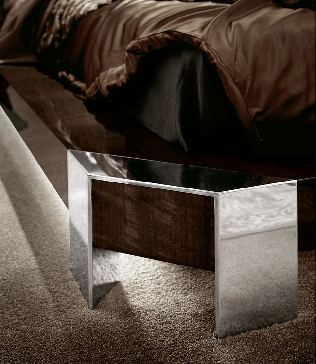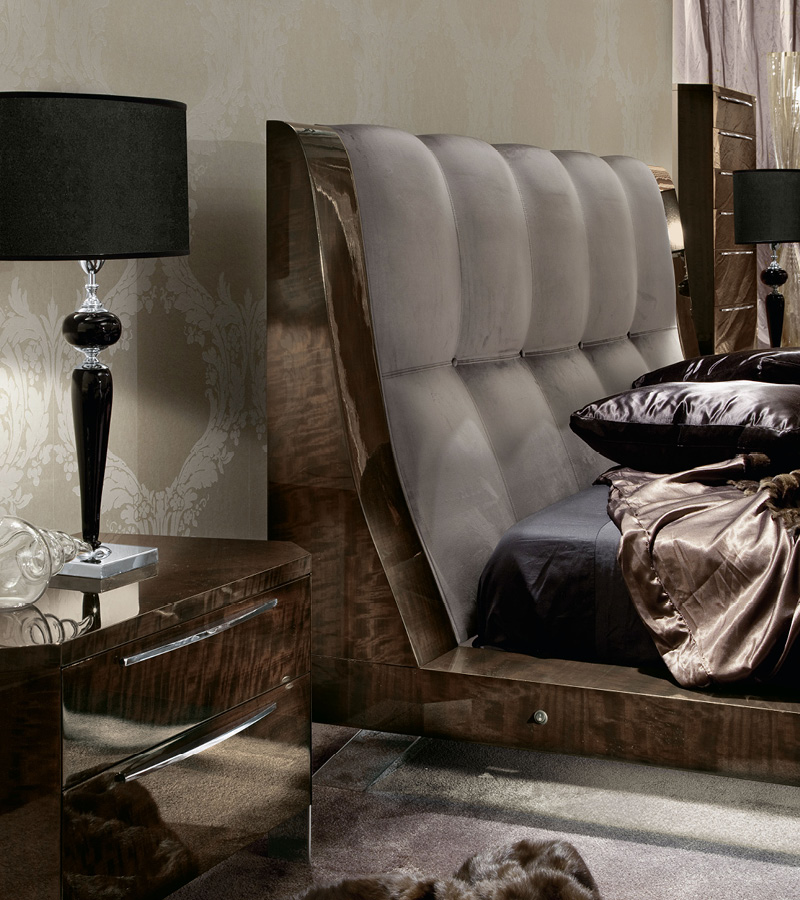 Bed in european curly eucalyptus veneer in high gloss polyester. Headboard covered in first grade leather, velvet or suede fabric. Special led light system with 2 switches, one each side-rail, included in the price. Chrome stainless steel feet.