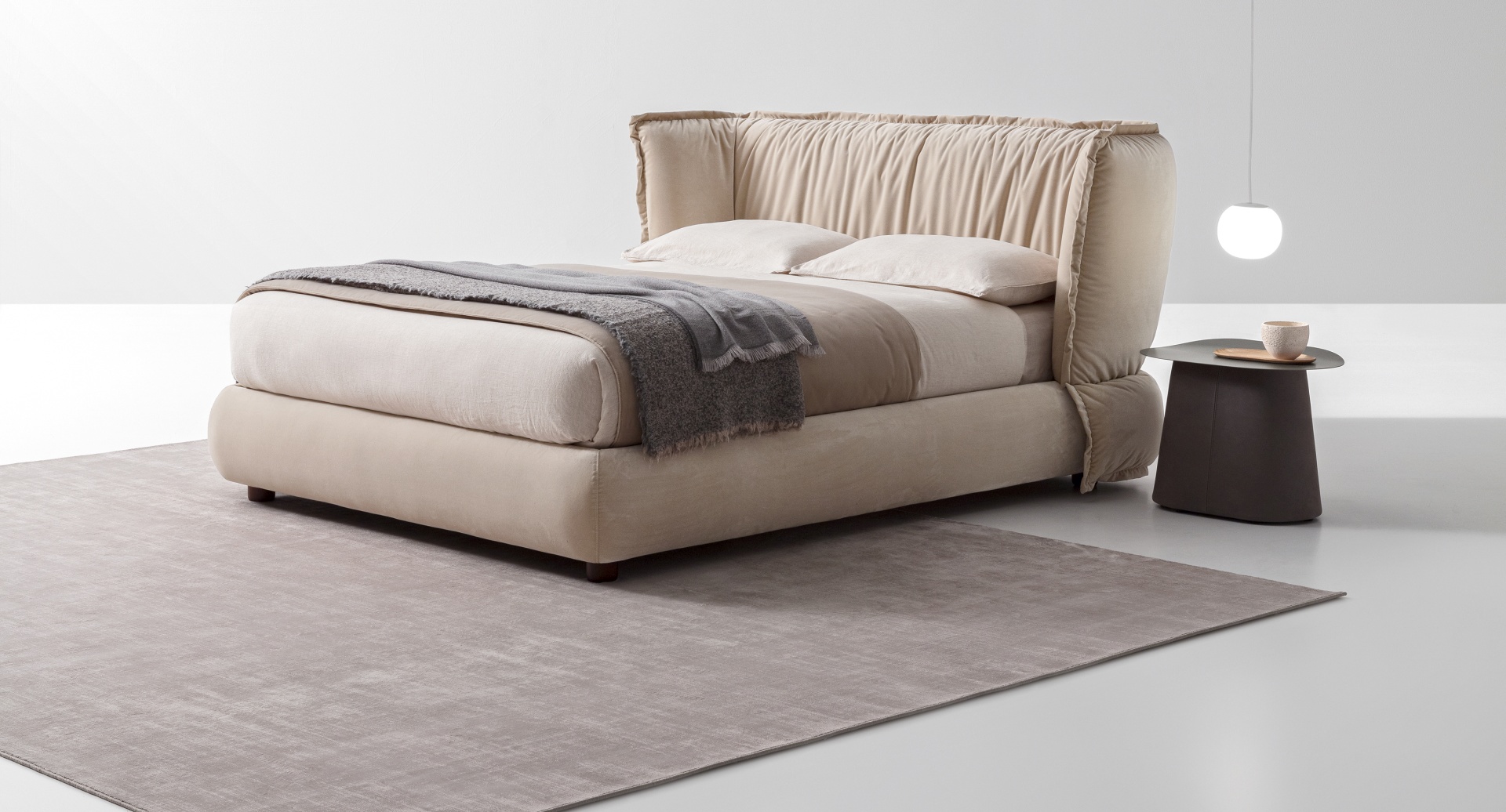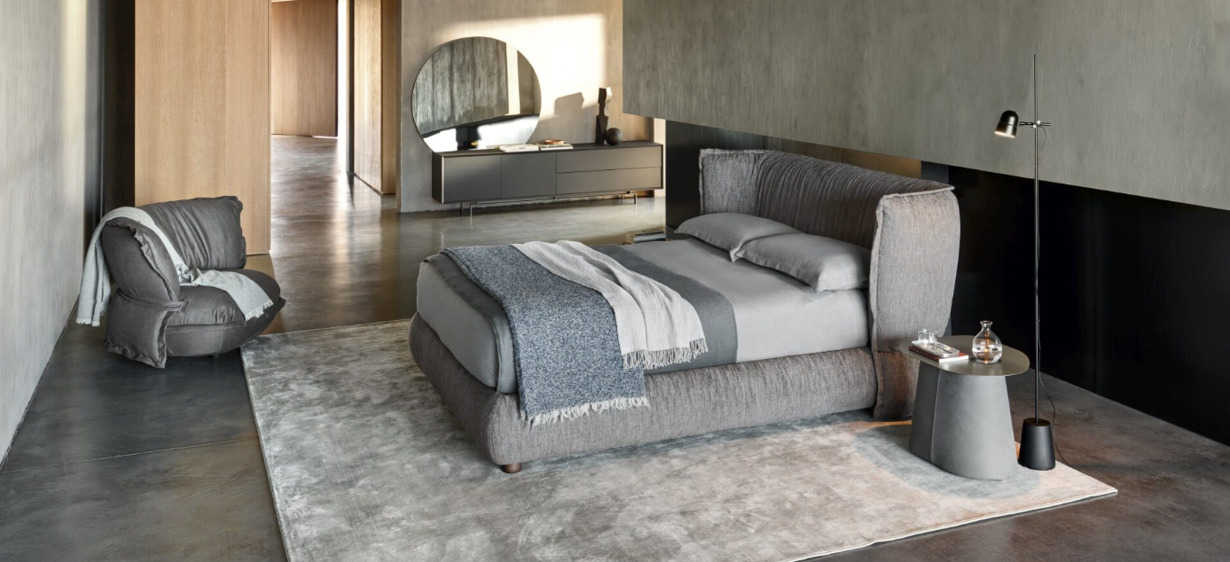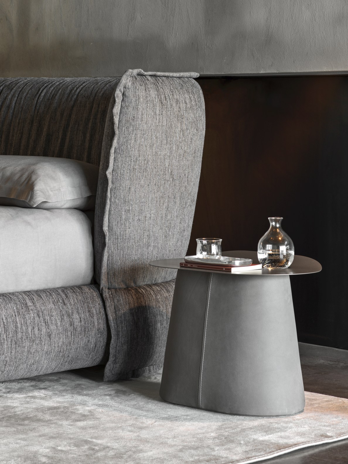 Un binomio di arredi per la zona notte. Un letto la cui generosa testiera rimanda all’idea – e alla forma – di un soffice guanciale; e un comodino che, per contrasto, risalta nella sua forma rigorosa e disciplinata, dettata da un piano di metallo e da una solida base rivestita di pelle oppure tessuto.