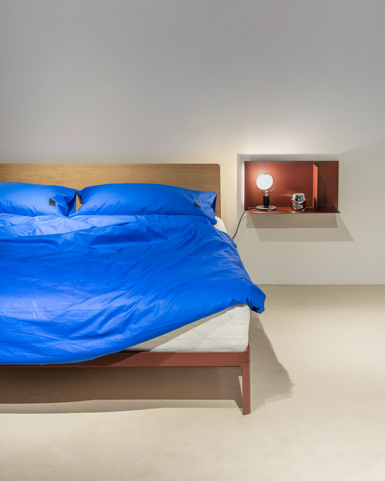 Reissue of the historic bed designed by Luciano Bertoncini in 2000. The structure is made of 100% recyclable aluminium, powder-coated, while the headboard is made of plywood or upholstered. Available in a compact package, is very simple to assemble and disassemble.