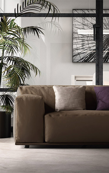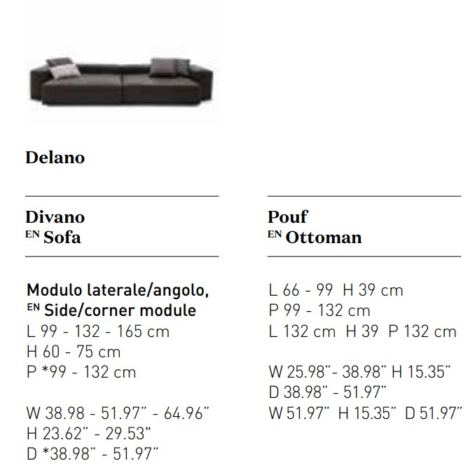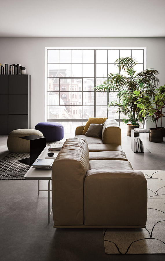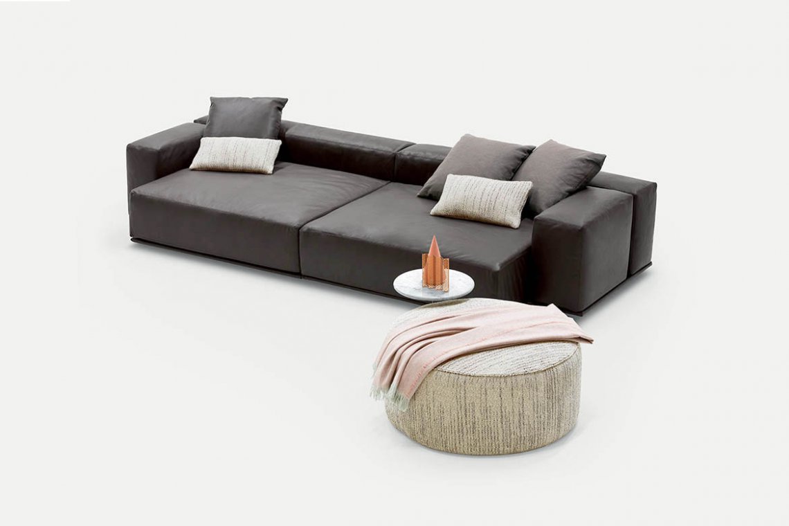 Dive into relaxation: cosy and generous, Delano’s soft, feather-filled seat is irresistible. Inviting and sophisticated, its design looks perfect in the middle of any room. Lots of modular arrangements are available, furnishing spaces in total freedom to utterly enjoy the pleasure of conviviality. There are two different backrest heights as well as two seat cushion depths that can be combined in creative configurations to which low shelving units can be added as armrests. All the volumes stand on covered bases.