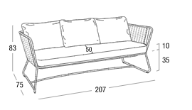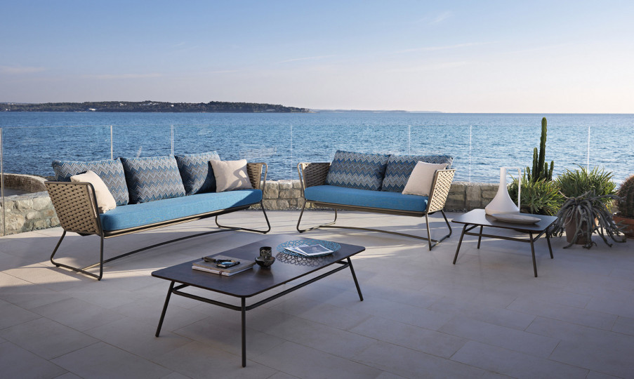 Divano in acciaio 304 verniciato a polveri, intrecciato con Flat Trendyrope. Un divano accogliente, dove la particolare geometria dello schienale si coniuga perfettamente al desiderio di comfort,  creando un angolo per vivere momenti di relax. Ottimo per arredare terrazzi e patio, dona forte personalità anche alle zone living interne. Ideale per arredamenti residenziali e contract.
