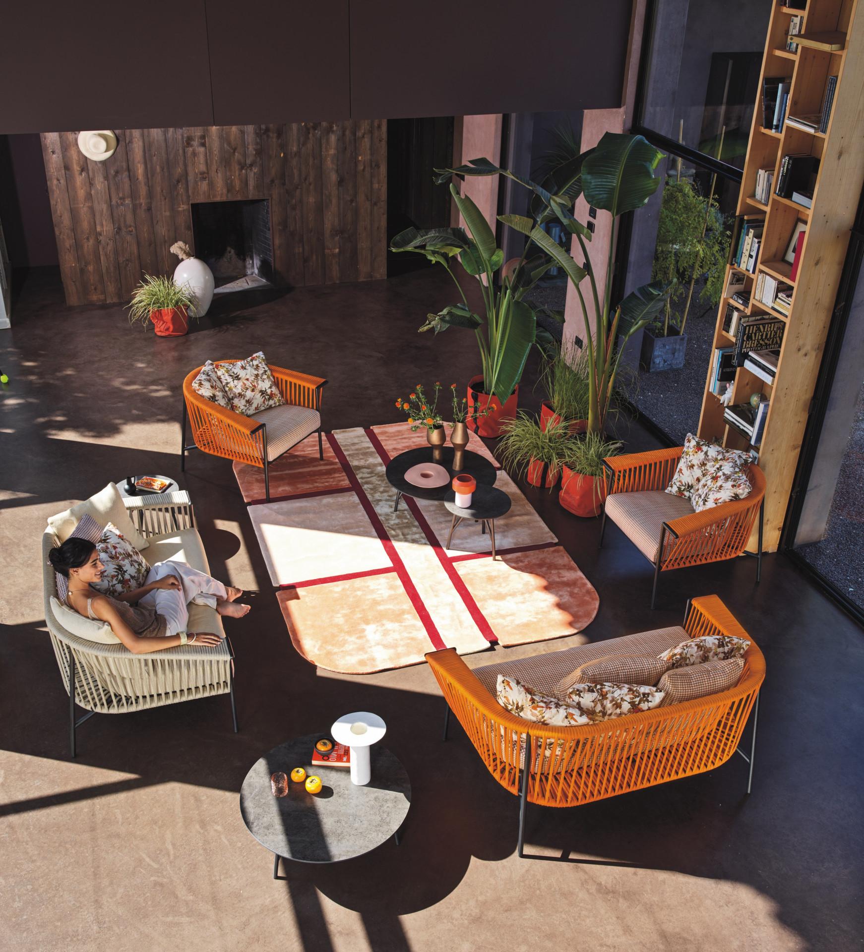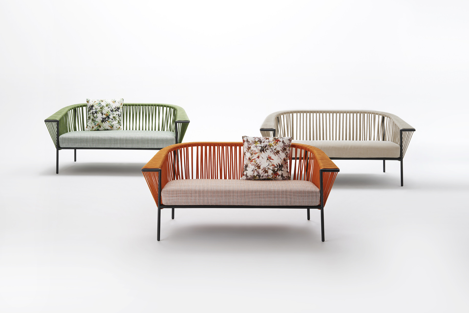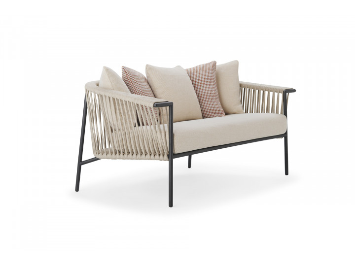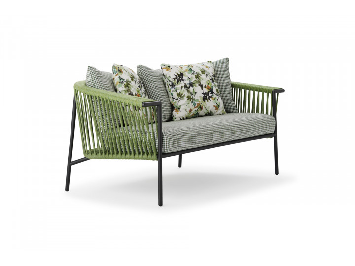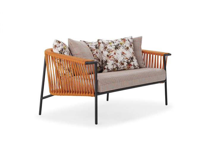 Divano in acciaio inox Aisi 304 verniciato a polveri, intrecciato in Oval Trendyrope. La particolare trama sdoppiata dell'intreccio e l'ampio bracciolo creano un design avvolgente, ispirato alla corolla di un fiore, ed il comfort di seduta è straordinario grazie alle proprietà della corda ovalizzata e alla cuscinatura. L'intera collezione è progettata sia per l'arredamento residenziale che per quello contract, sia per gli spazi outdoor che indoor.
