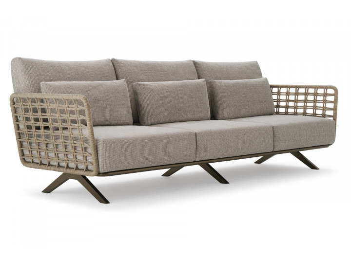 Divano 3 posti in acciaio inox Aisi 304 ed alluminio, verniciato a polveri ed intrecciato in Oval Trendyrope. Linee che valorizzano l'iconico stile italiano, dove le lavorazioni in corda donano un'estetica materica ed artigianale alla morbidezza avvolgente delle sedute, per concepire uno spazio ideale, dedicato al relax e alla socializzazione. Progettato sia per l'arredamento residenziale che contract, outdoor e indoor.