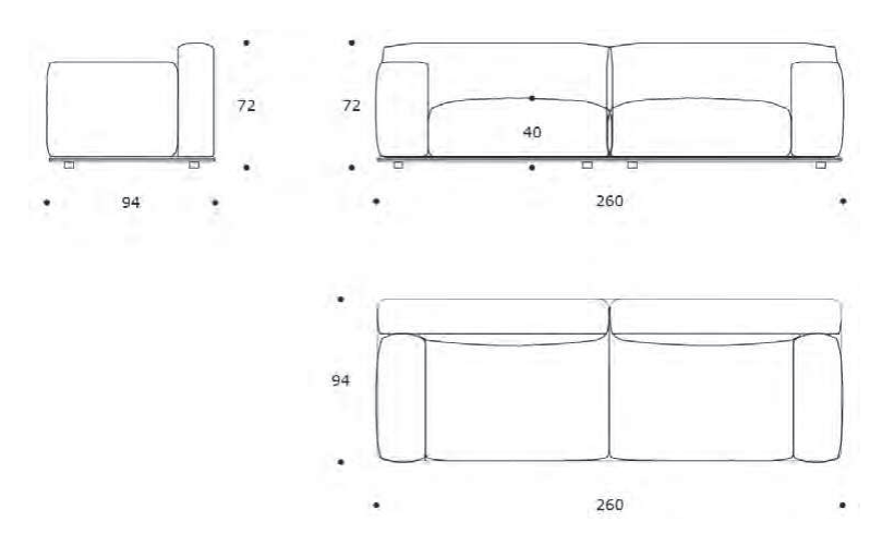 Dimensioni: larghezza 260 cm, altezza 72 cm, profondità 94 cm.