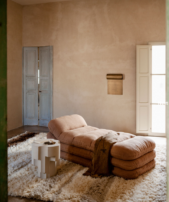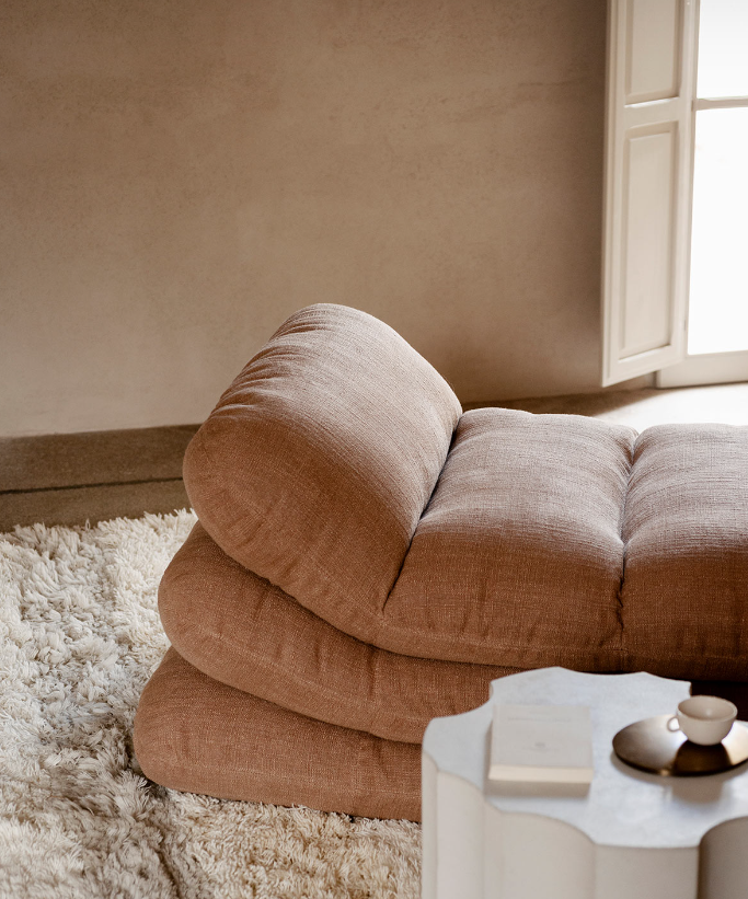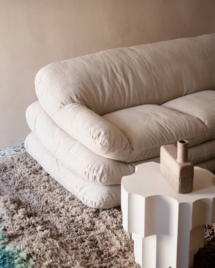 Calm and sophisticated manifesto of contemporary style, Solar sits at the heart of Toogood’s Cosmic collection. An upholstered sofa that at first glance appears as a stack of cushions. With its unmistakable blend of ingenuity and style, Faye Toogood invites relaxation upon these quilted piles. Solar merges sculptural forms and softness, offering a fresh interpretation of Tacchini’s iconic upholstery. The fabric intentionally crinkles, giving the seating a generous push. Solar boasts a relaxed aesthetic embodying the casual elegance of Faye Toogood’s studio. Its soft tactility sets it apart among Tacchini’s range of bold and captivating furniture.