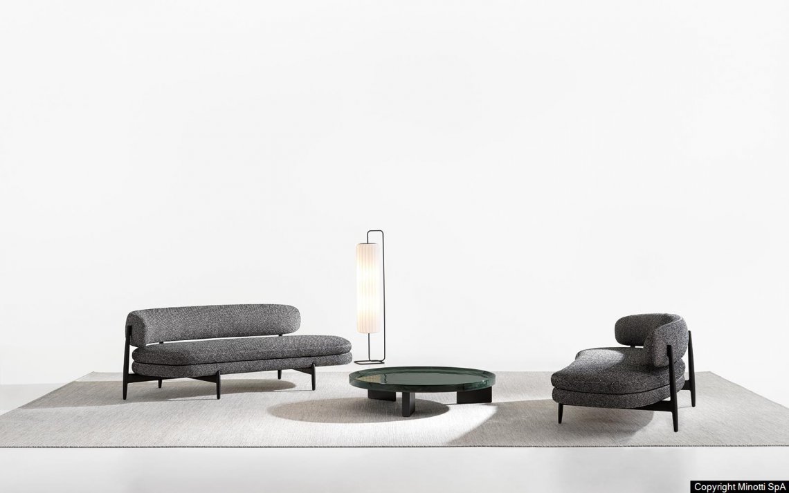 The architecture of this object, raised off the ground, rises above the seat to support and frame the backrest, lending an aerial elegance to this sofa proposed by Minotti for both residential and hospitality projects.