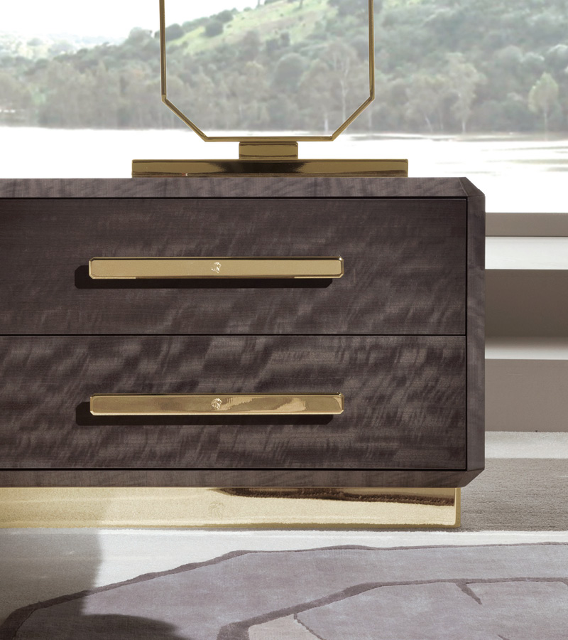 Night table in makorè mahogany veneer with highgloss polyester finish. Inlaid veneer top, 2 full extension drawers with bottom part in velvet fabric. Base and handles in light gold chrome stainless steel with Giorgio Collection logo.