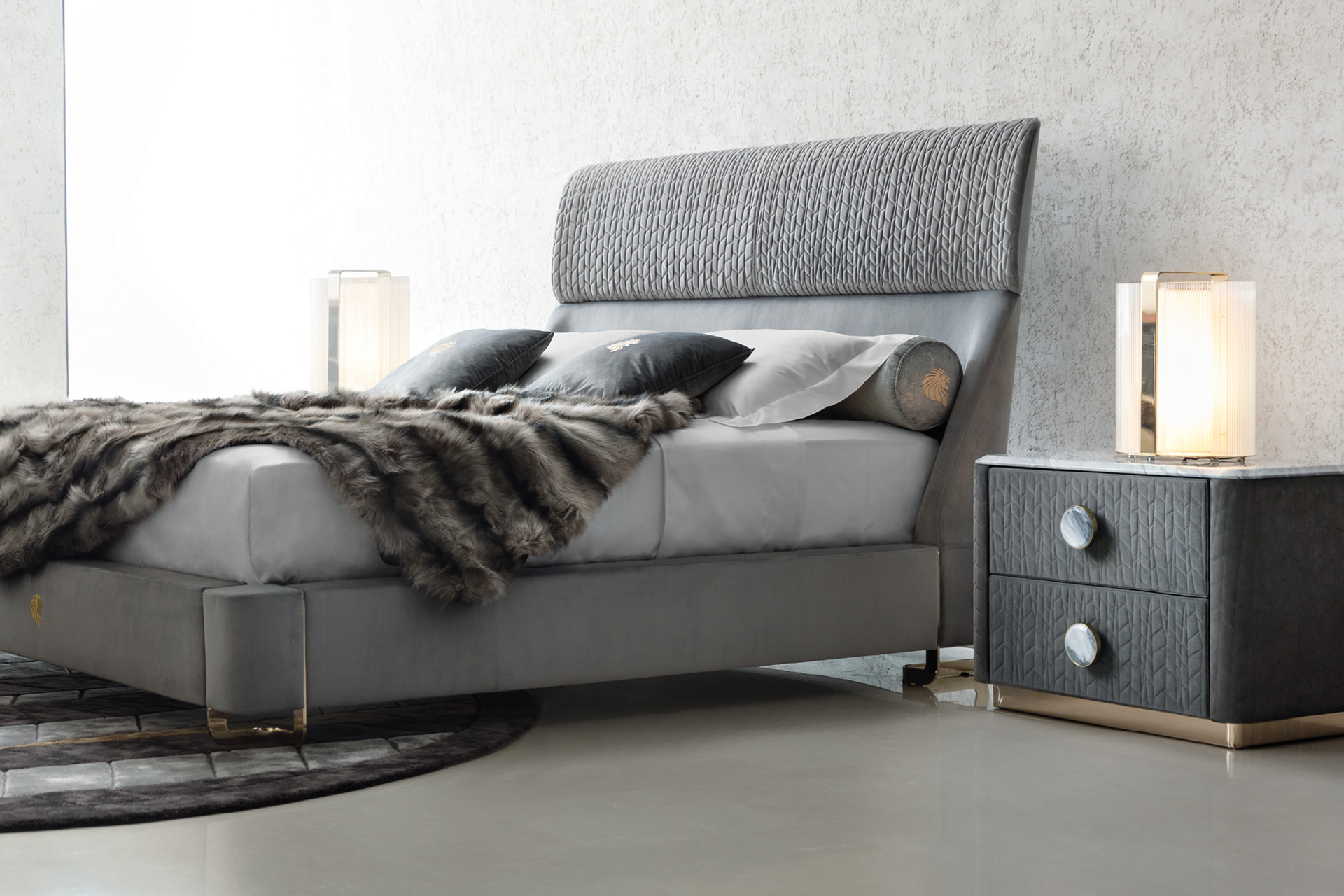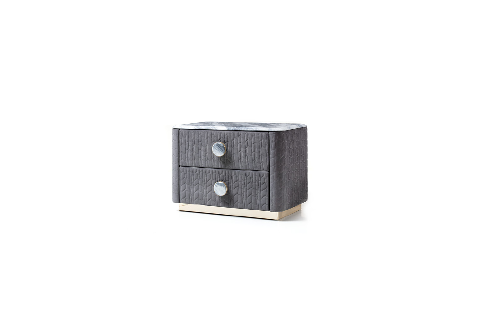 Night table with top in beveled marble. Base in light gold chrome stainless steel. 2 big center handles in combination with gold chrome stainless steel and beveled marble. 2 full extension drawers with bottom part in velvet fabric.