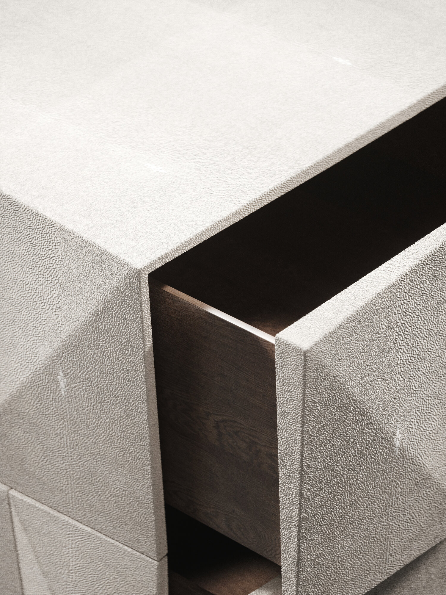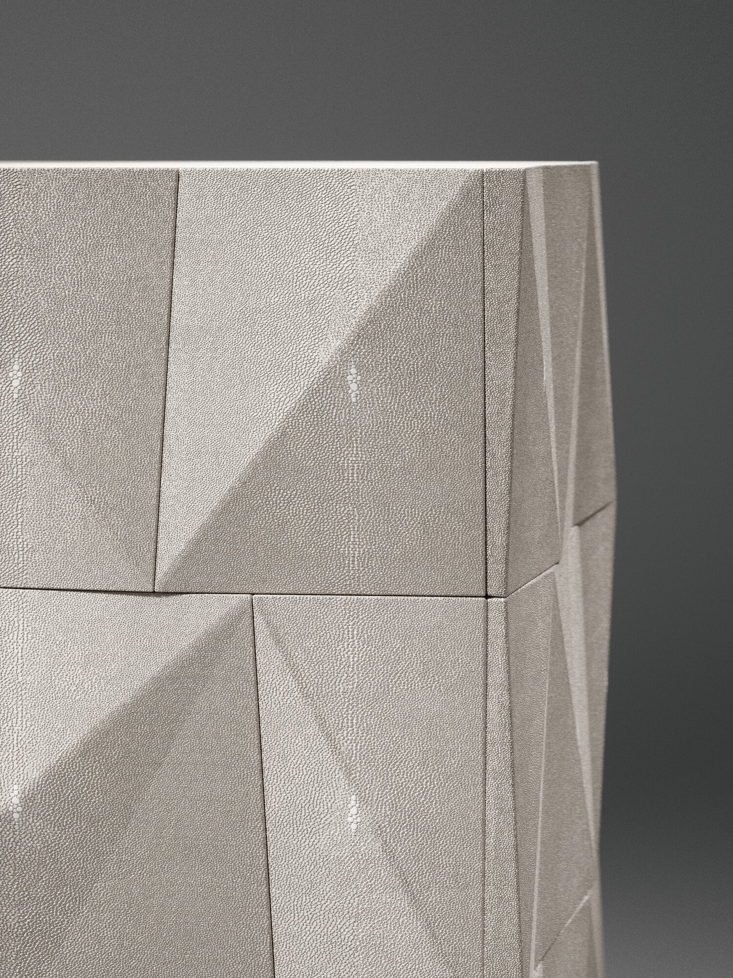 The Rhomboid bedside table by R&Y Augousti is an elegant piece with its fun geometry. This bedside table is completely inlaid in cream shagreen and sits on the option of discreet cut-out bronze-patina brass or solid bronze-patina brass legs. This bedside table includes a total of three drawers. The irregular "rhomboid" surface demonstrates the incredible artisan work behind Augousti.