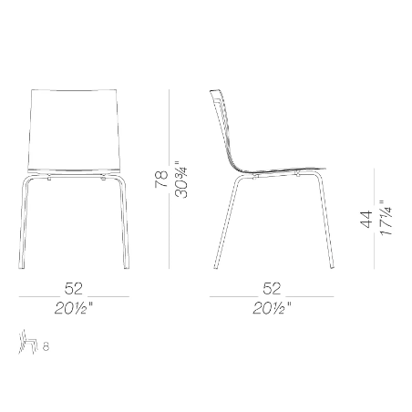 Nella sedia THIN, il legno, finissimo sull’esterno, nella parte centrale diventa più spesso per sostenere al meglio la schiena. Una lavorazione millimetrica, che si traduce in un risultato sorprendente.