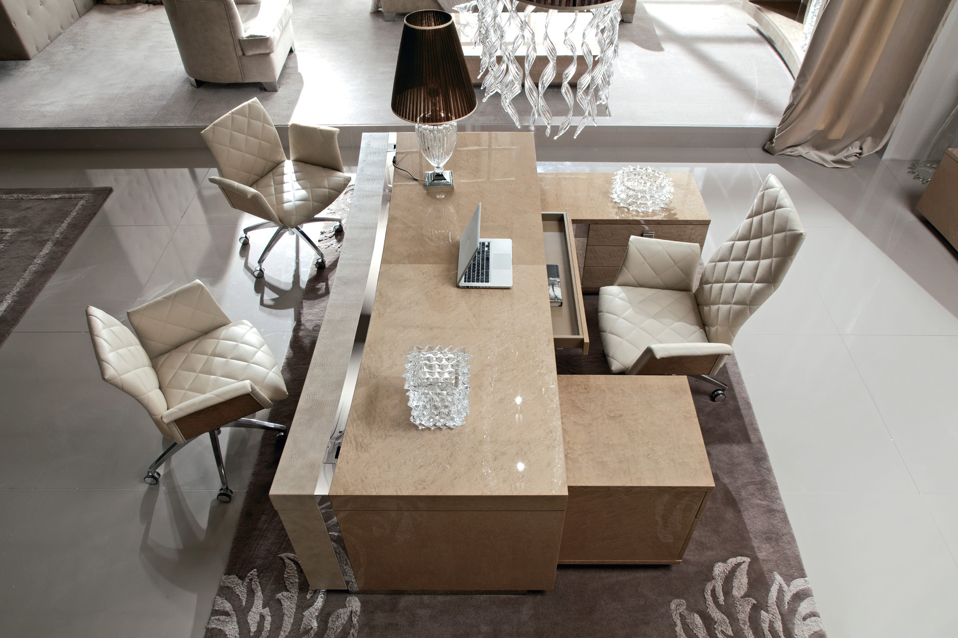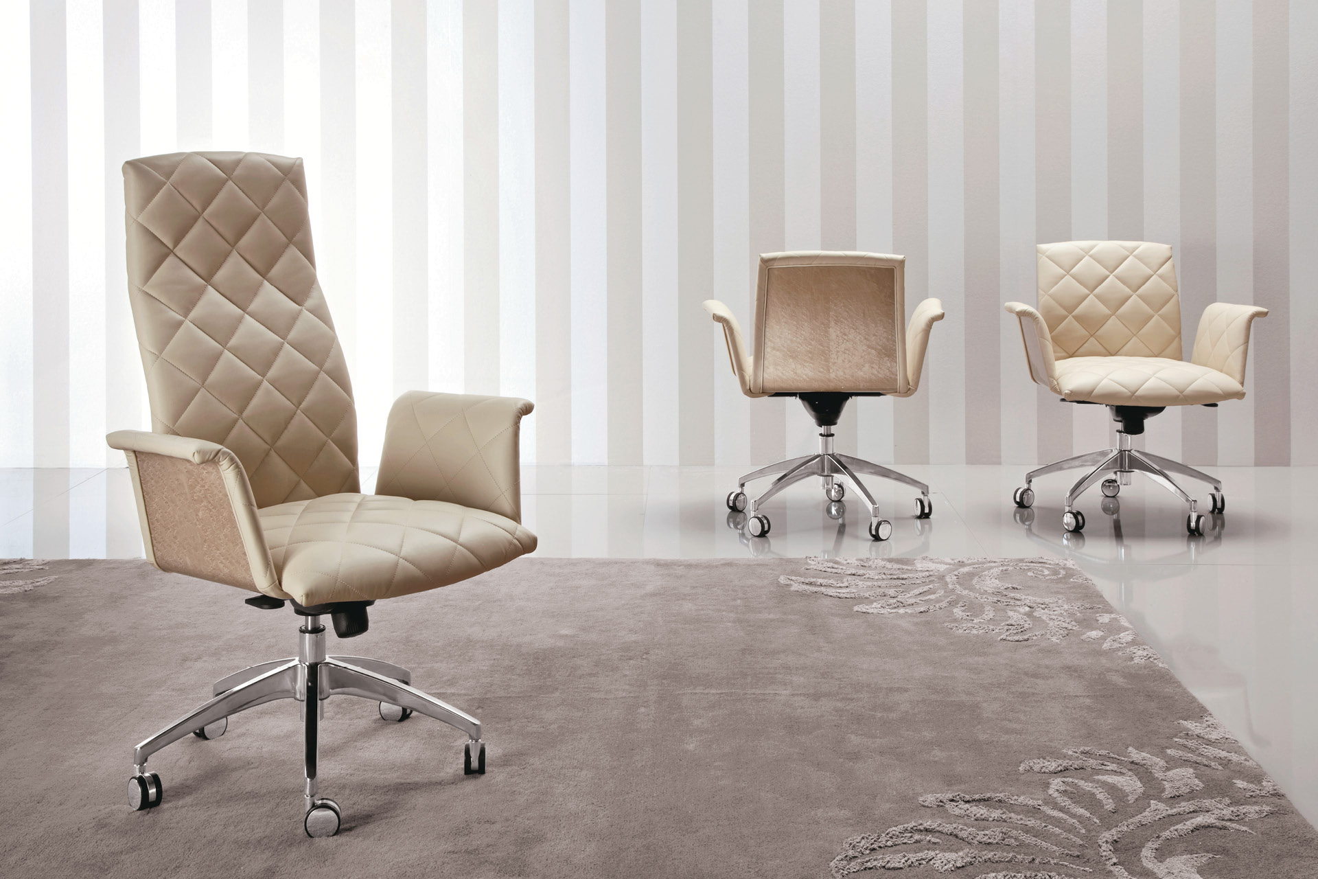 Presidential office chair on wheels with adjustable height, back and side panels in high gloss polyester champagne bird’s eye maple veneer. Available in leather, printed iguana leather, velvet or suede. Leather need: mt. 3,20 Fabric need: mt. 2,20