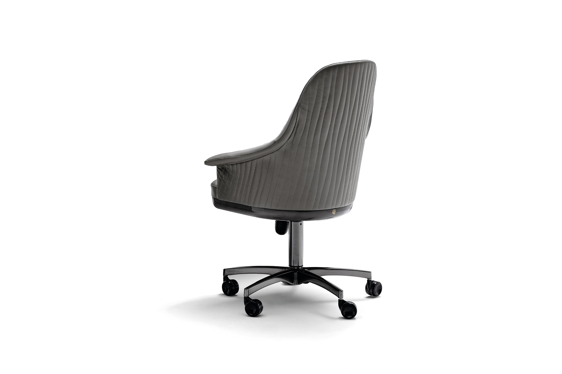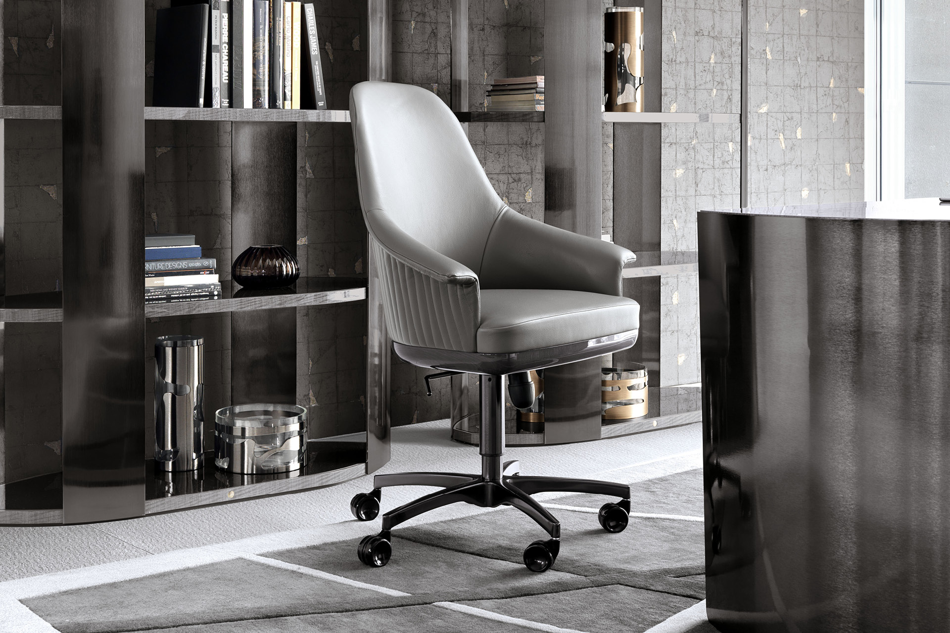 Fully upholstered home office chair in solid beech on wheels with adjustable seat height (cm. 44/52). Back in quilted first grade leather, nubuk leather, lizard printed leather, velvet or suede fabric. Wooden frame seat with Giorgio Collection logo. Base in satin black nickel stainless steel.