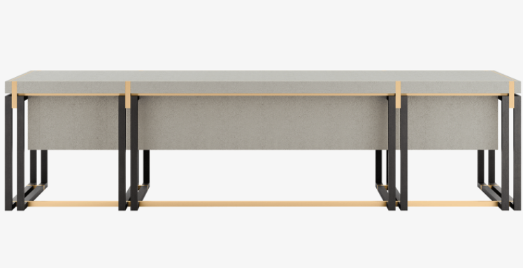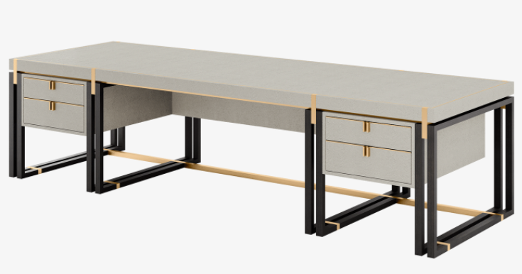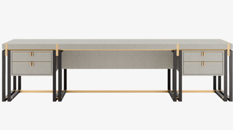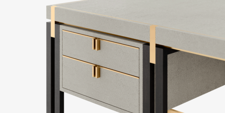 An imposing design, the SEOUL desk provides a vast workspace that measures 300 centimetres in length. Crafted from a rich material mix that includes solid wood, brushed brass and leather, it also incorporates accessible storage in the form of four suede-lined drawers.