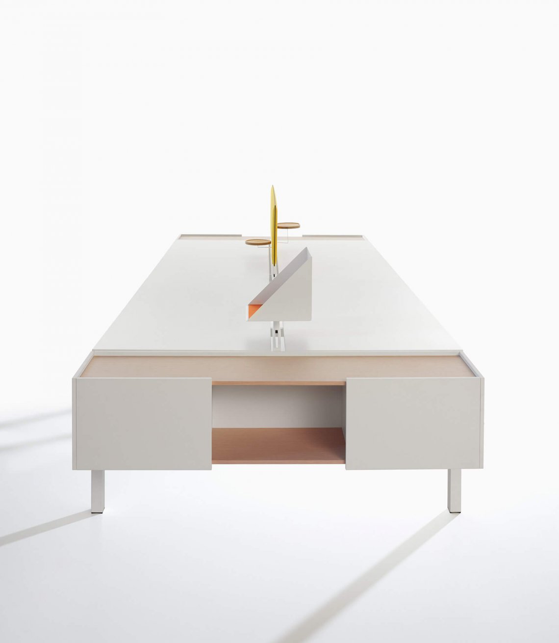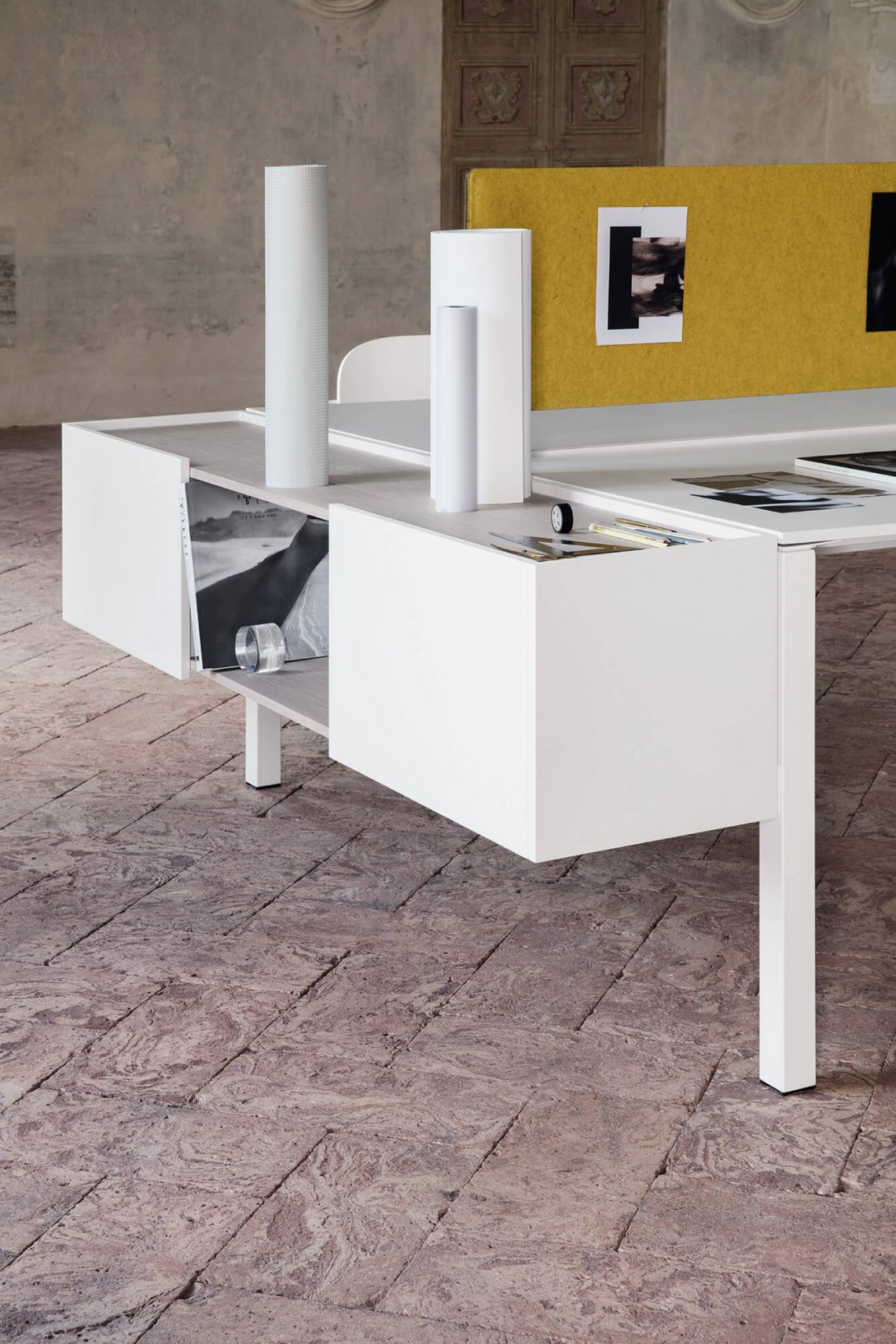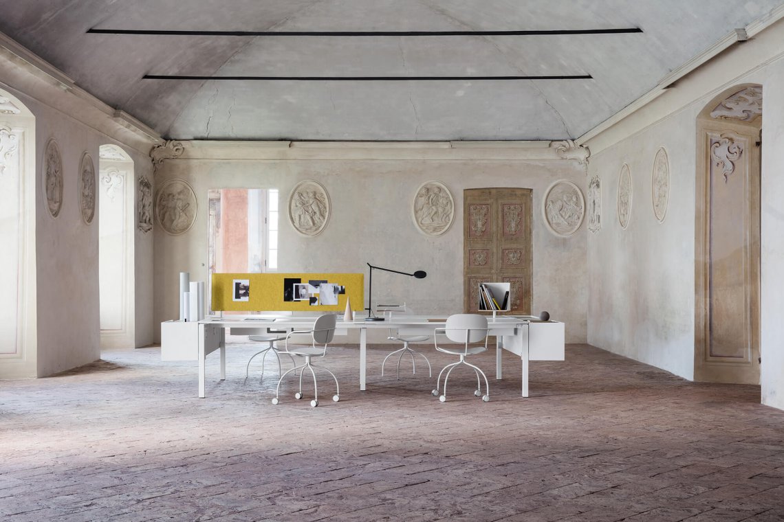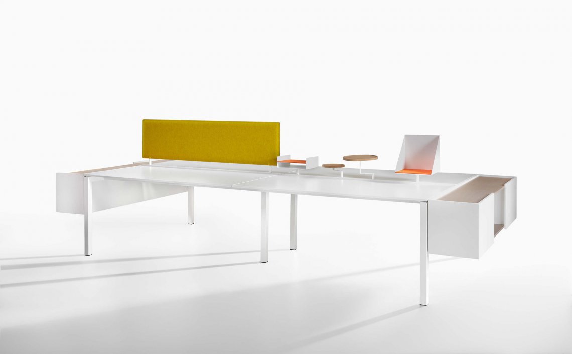 One is an essential, functional desk system intended for operational offices. It is easily configurable to comply with the space and the requirements. A range of accessories makes it characteristic and versatile. The side cabinet can become a locker. The padded dividing screen and accessory bar add a touch of colour to the composition. A square or T-shape leg is available.