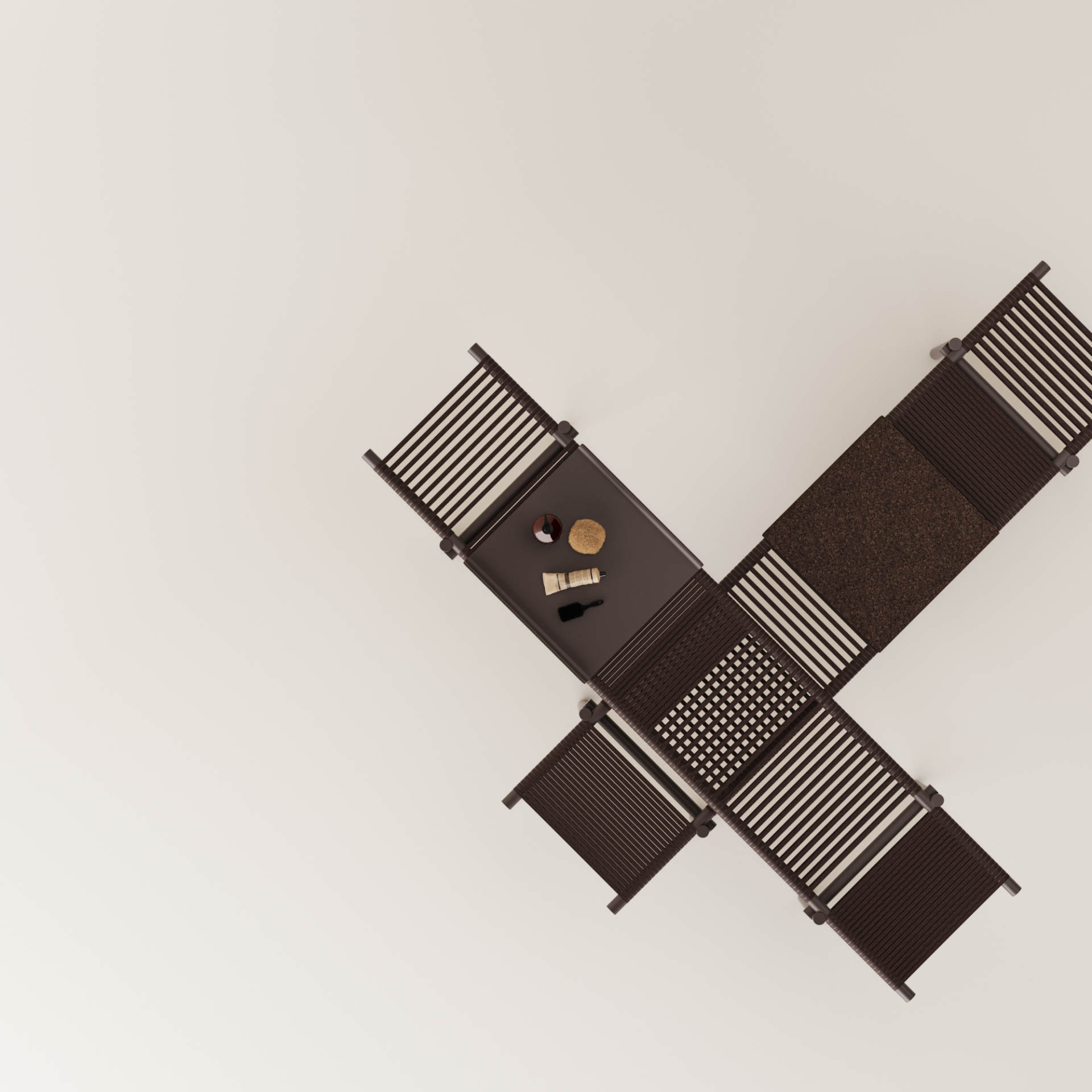 Three daybed benches in three different heights can be used individually or stacked as desired, creating a space to sit, have a conversation, or stretch out and relax. The surface consists of hand-woven ropes of cork, with a technical metal core. The supports and frame are made of recycled aluminum tubing painted in a warm brick- red color. They are designed to be water- resistant, giving them a place in a home environment as well as in hotels and hospitality, even outside the bathroom or outdoors - the only limit is your imagination.