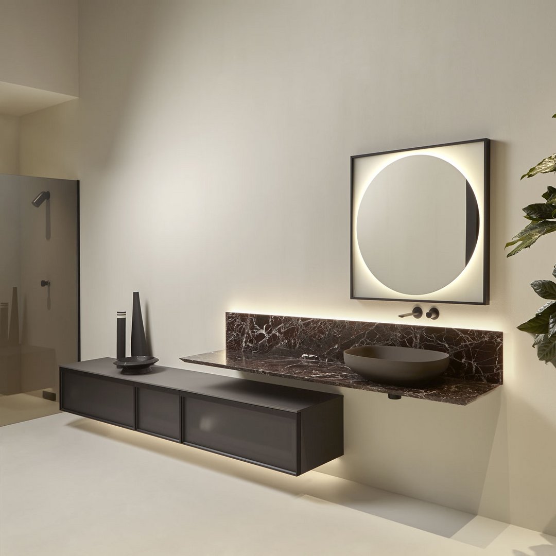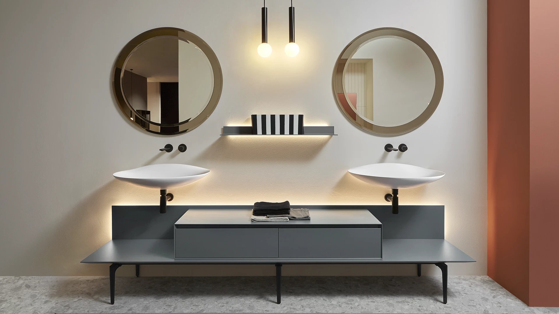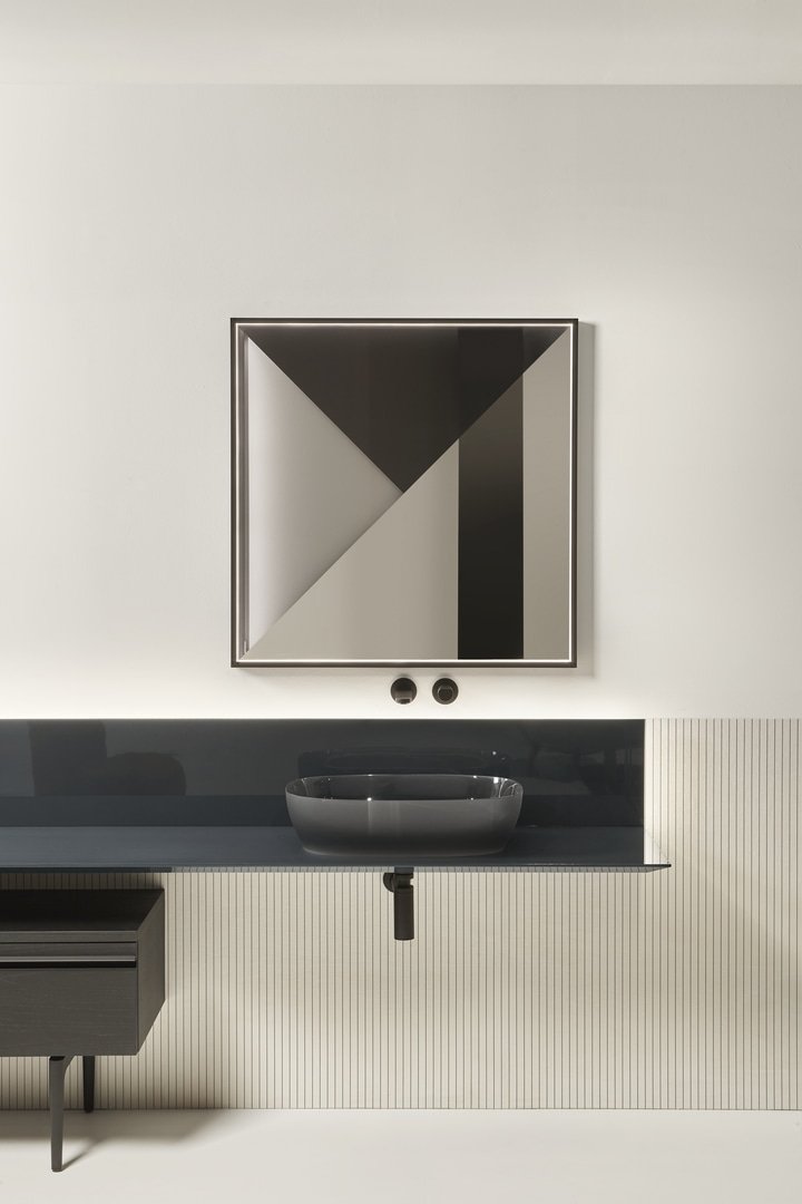 Un progetto essenziale nella forma quanto articolato nella funzione, un sistema componibile che parte da un elemento base per declinarsi in molti modi diversi, un concept che nasce dalla definizione di una semplice mensola a “L” che diventa piano d’appoggio su cui posizionare contenitori, lavabi, accessori e oggetti per l’ambiente bagno e non solo. Un corpo semplice e lineare ancorato alla parete, disponibile nella versione laccata o in essenza legno, che fa da supporto a elementi diversi per forma, materiali e colori.