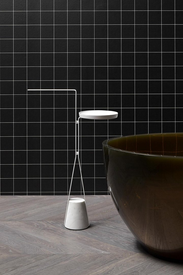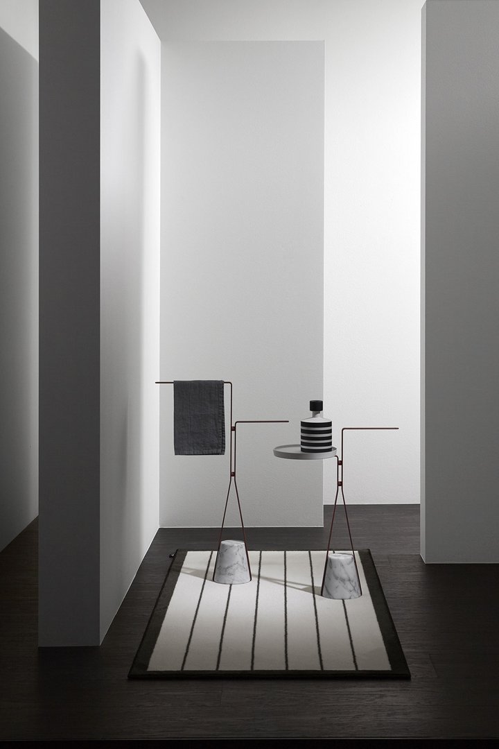 La matericità della base, l’elegante traiettoria descritta dalla struttura, per un equilibrio che nasce dal contrasto tra la volontà di librarsi nell’aria e la forza di gravità che vi si oppone, per ancorarla a terra. Come un elastico che viene trascinato verso il basso, ma che trova poi resistenza e consistenza per diventare a sua volta supporto. Halo è una famiglia di piantane e tavolini che ridefinisce l’immagine di un elemento funzionale per le abitudini quotidiane all’interno del bagno, ma che strizza l’occhio anche ad altri ambienti della casa, per i quali si rivela molto utile, ad esempio, nella versione fermaporta.