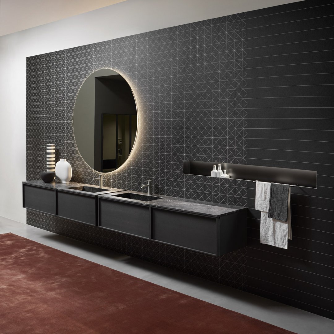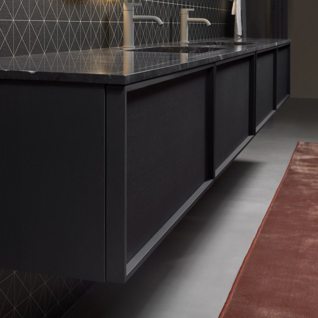 Una geometria pura, un volume nitido, regolare, perfetto nella sua essenzialità ma arricchito dal fascino della materia, una collezione contemporanea ma capace di inserirsi in contesti di stile diversi grazie ai materiali, colori e finiture disponibili, un elemento che esprime leggerezza ed eleganza, un equilibrio dimensionale che fa degli spessori sottili il proprio tratto distintivo. Il tratto distintivo di Riquadro è appunto la cornice evidente, il telaio dell’anta esplicitato in rilievo, un frame prezioso che definisce lo spazio, lo delimita, completandolo.