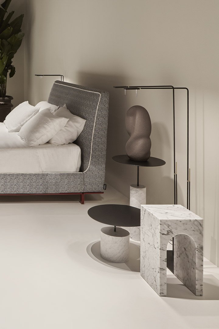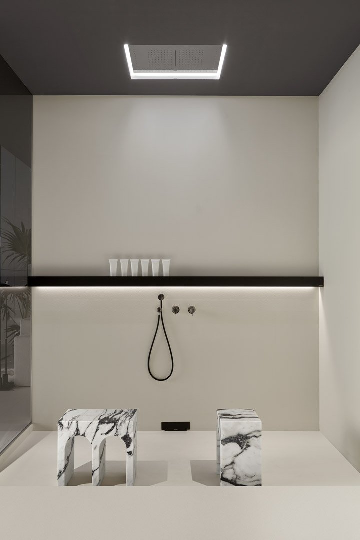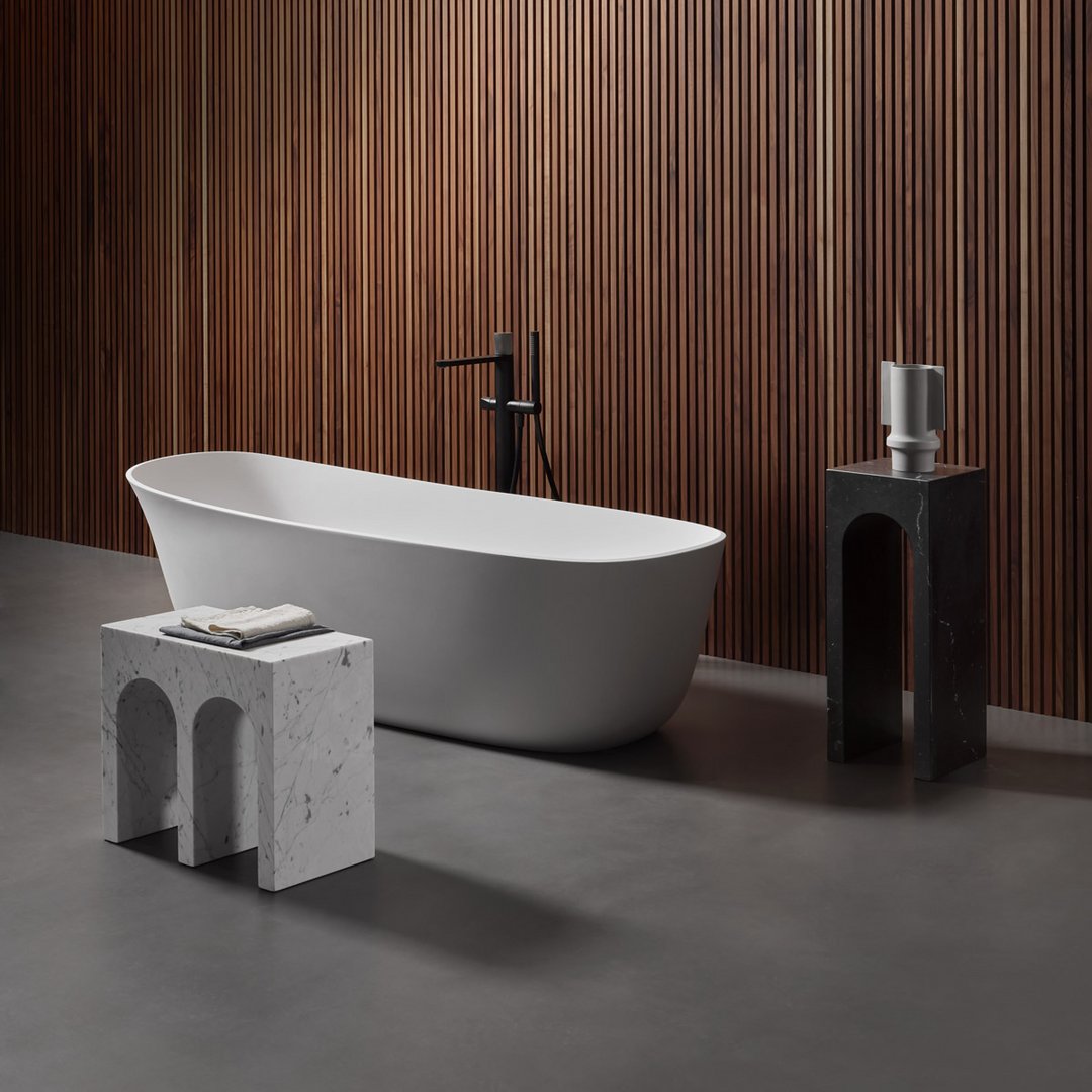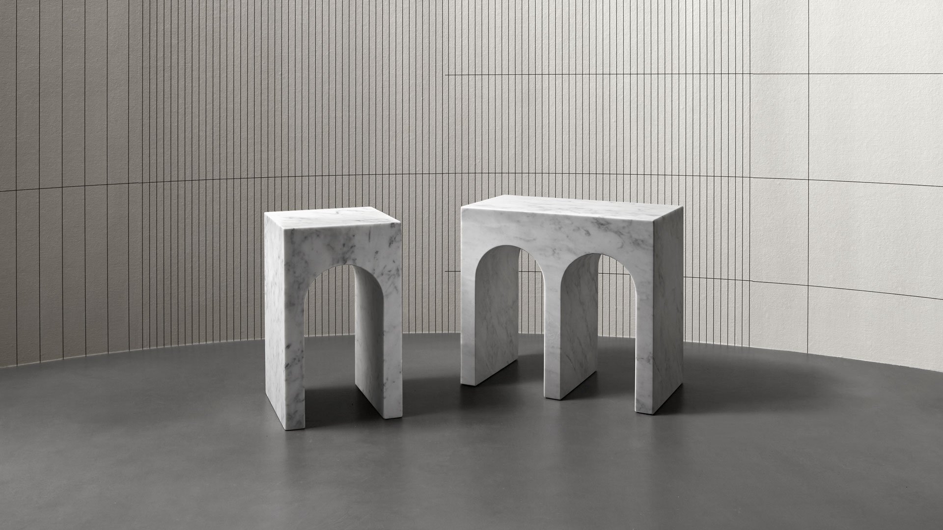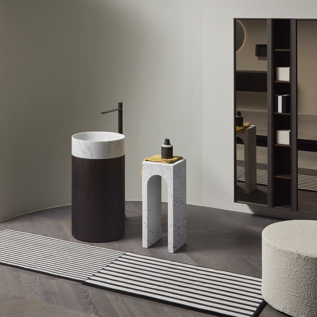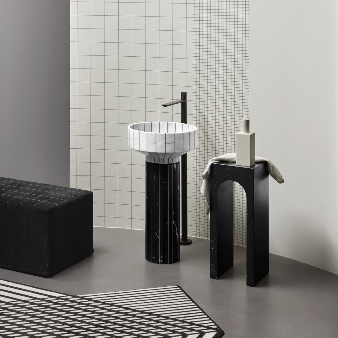 Il profilo è quello inconfondibile del Palazzo della Civiltà Italiana, simbolo del quartiere EUR a Roma, con la sua geometria assoluta e la successione di aperture ad arco; il materiale, il marmo Bianco Carrara, rimanda alla classicità delle forme all’imponenza delle dimensioni, degli spessori, all’eleganza assoluta e senza tempo. Il salto di scala consente di passare da un edificio a un oggetto con coerenza di stile ed equilibrio proporzionale. La collezione di tavolini Roma nasce così, come alleato prezioso nell’ambiente bagno ma anche come comodino accanto al letto o ancora in un living dall’arredo ricercato. Disponibili nella versione singola o doppia