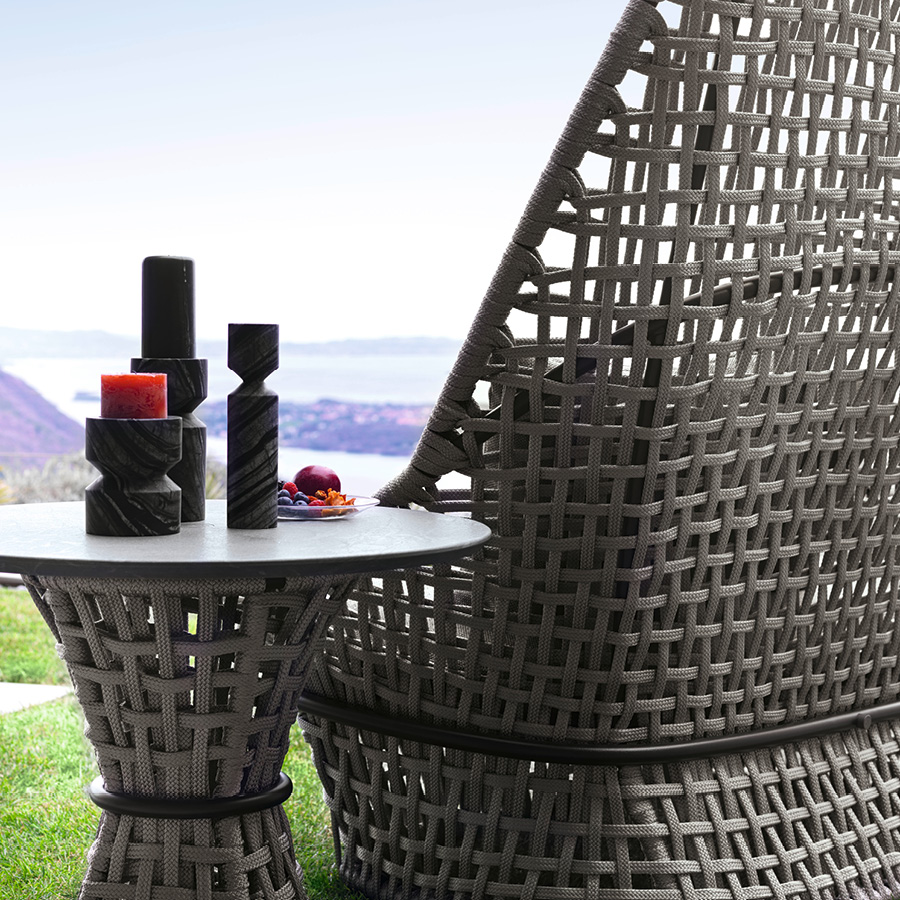 Outdoor occasional chair with high back available in special treated fabric or first grade leather. Cushion filling in waterproof dacron. Structure in combination of satined black metal treated in cataphoresis with inserted Giorgio Collection logo and woven cordage.