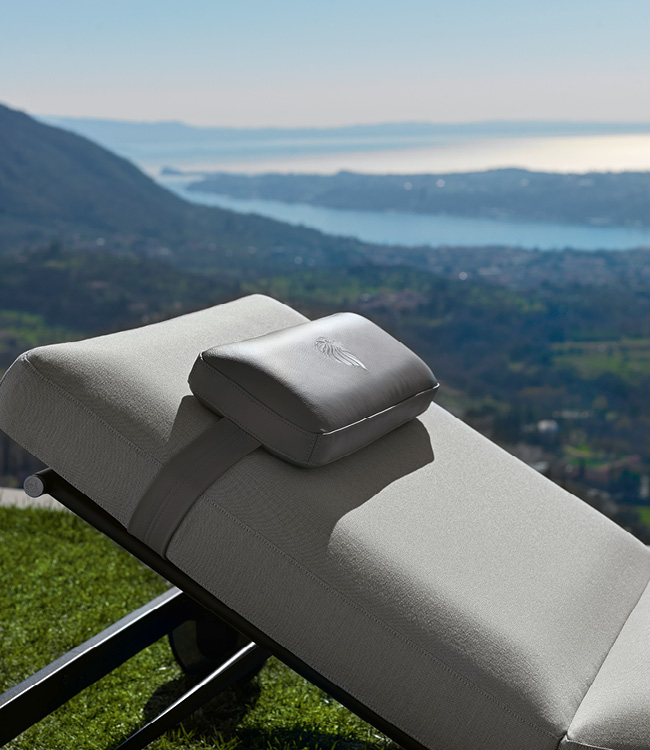 Outdoor sunbed available in special treated fabric or first grade leather. Headrest with embroidered Giorgio Collection logo. Structure in satined black metal with inserted Giorgio Collection logo and adjustable inclination.