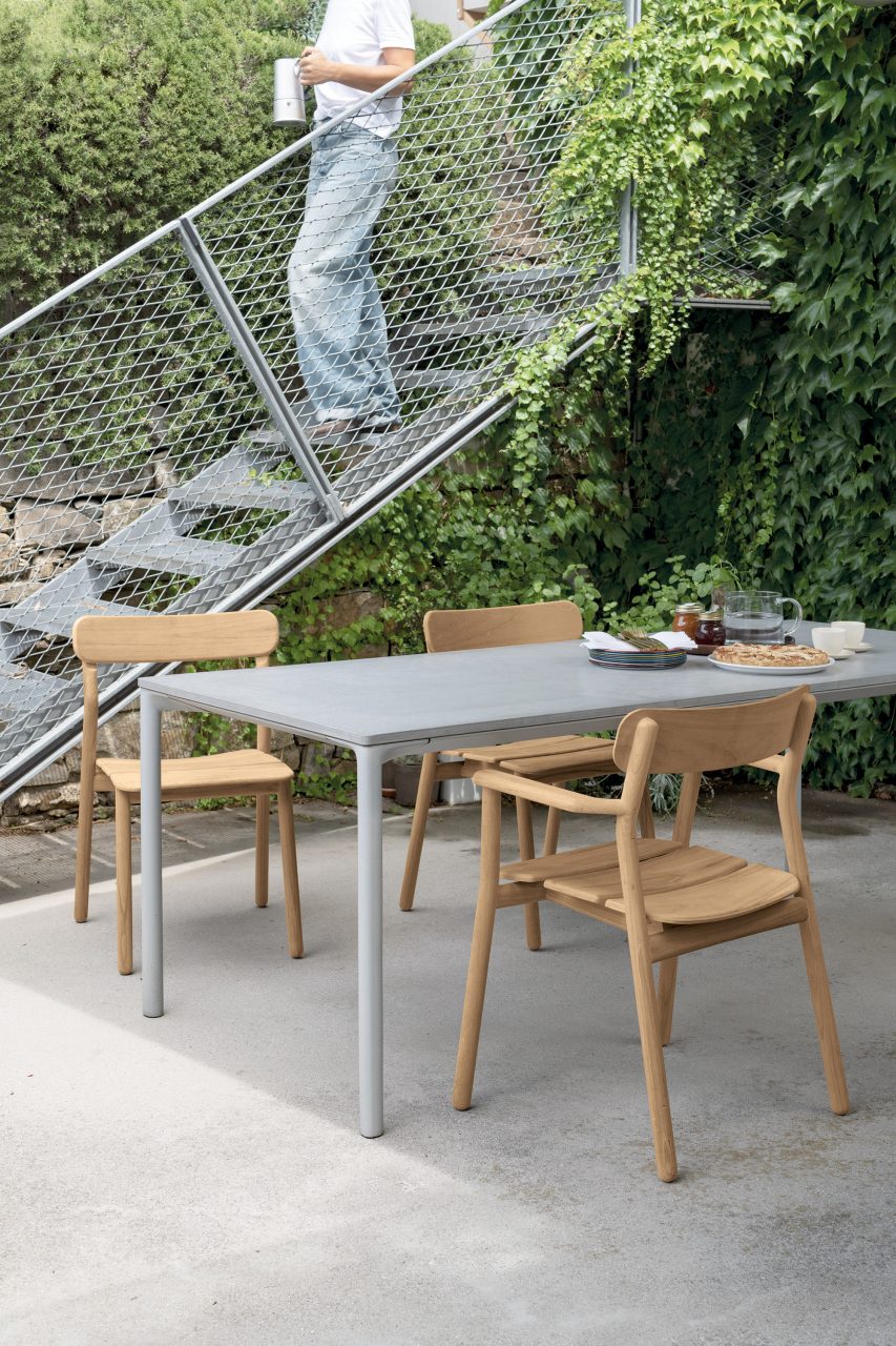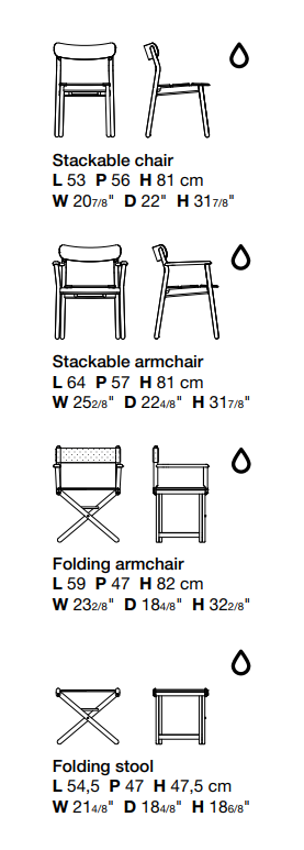 The timeless elegance of this chair arises from the reinterpretation of teak slats, which acquire soft, rounded shapes. The folding director’s version has lightly padded upholstery.
