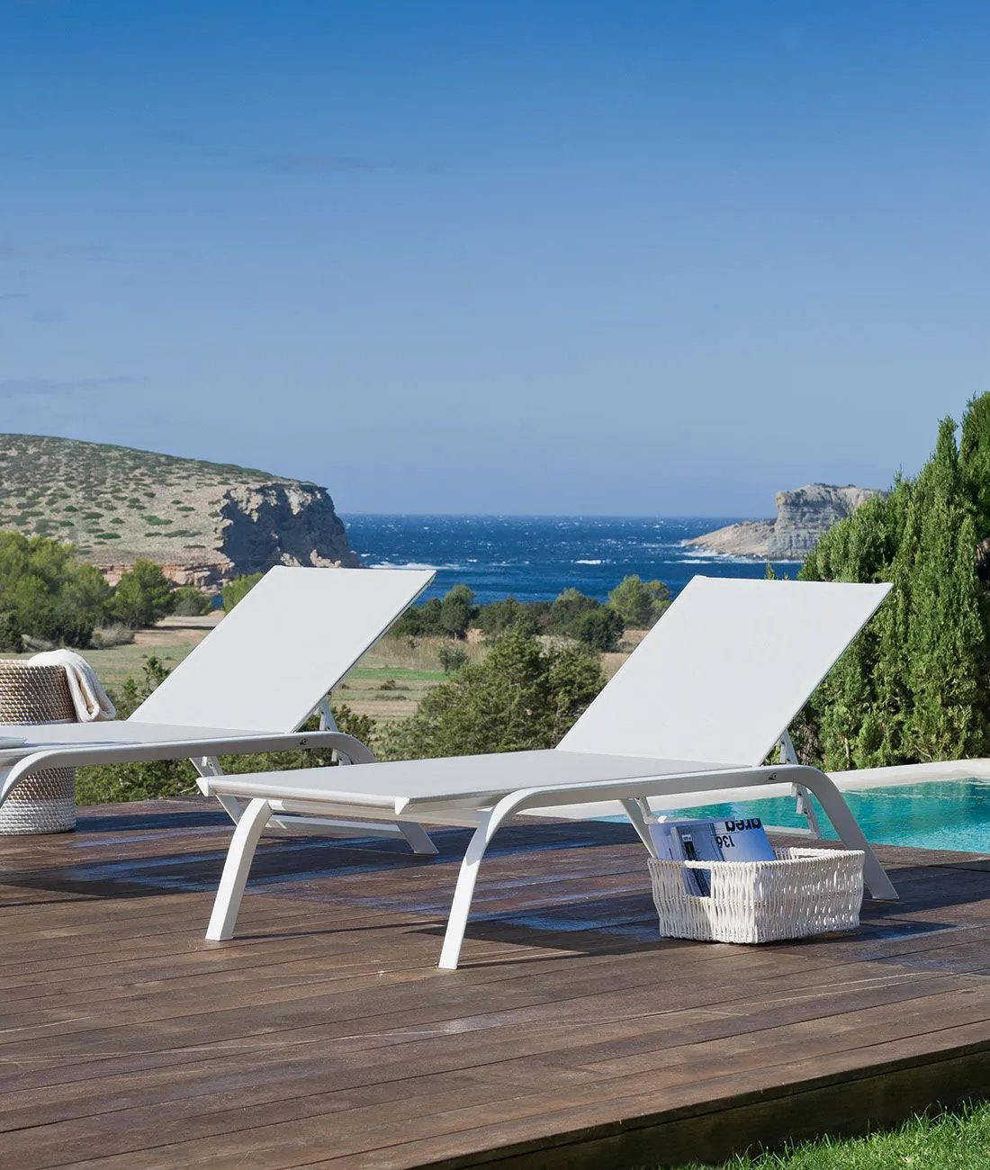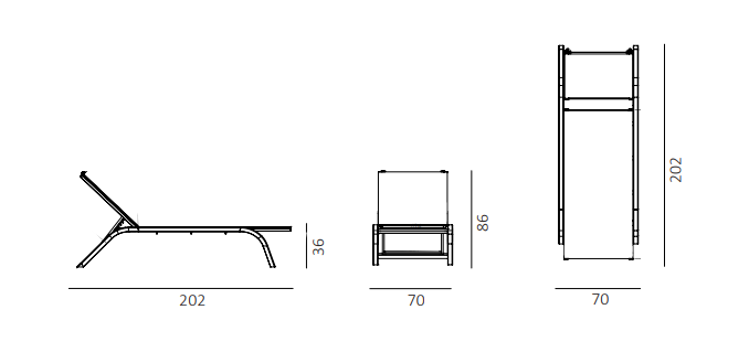 ll lettino è realizzato in alluminio con un tessuto tecnico che unisce la resistenza del PVC alla morbidezza della trama composta da ciniglia di poliestere. Disponibile nei colori grafite e bianco.