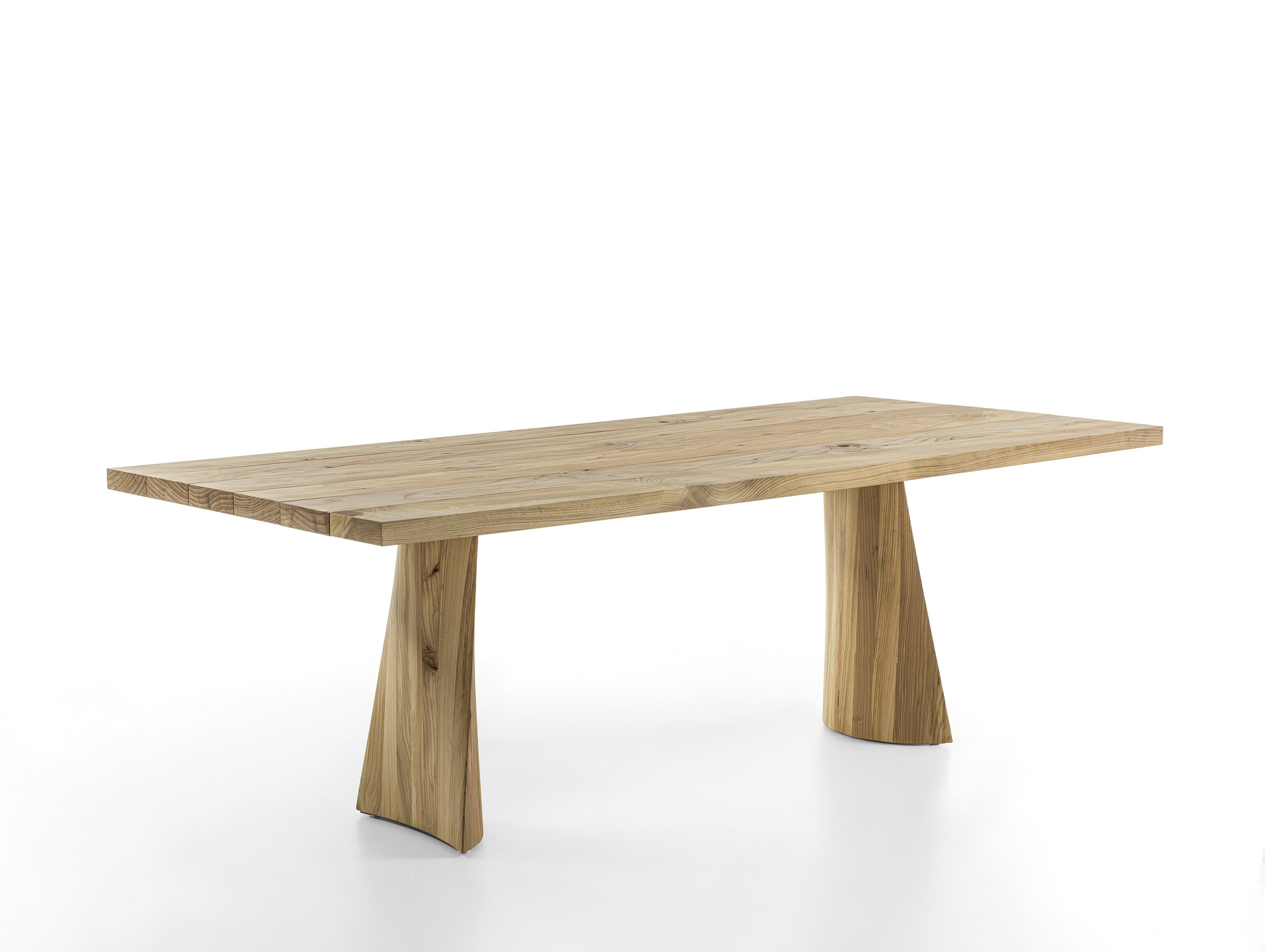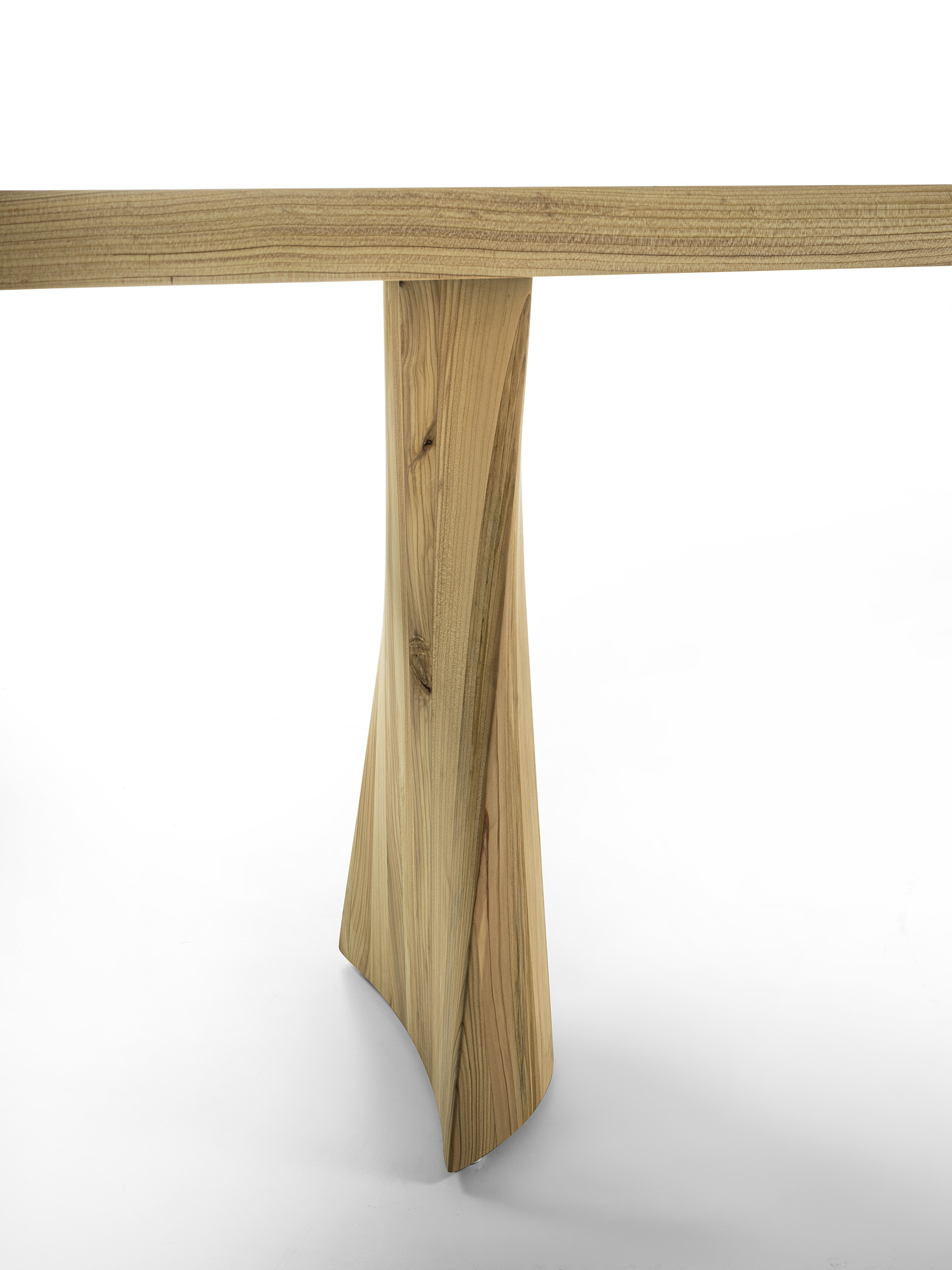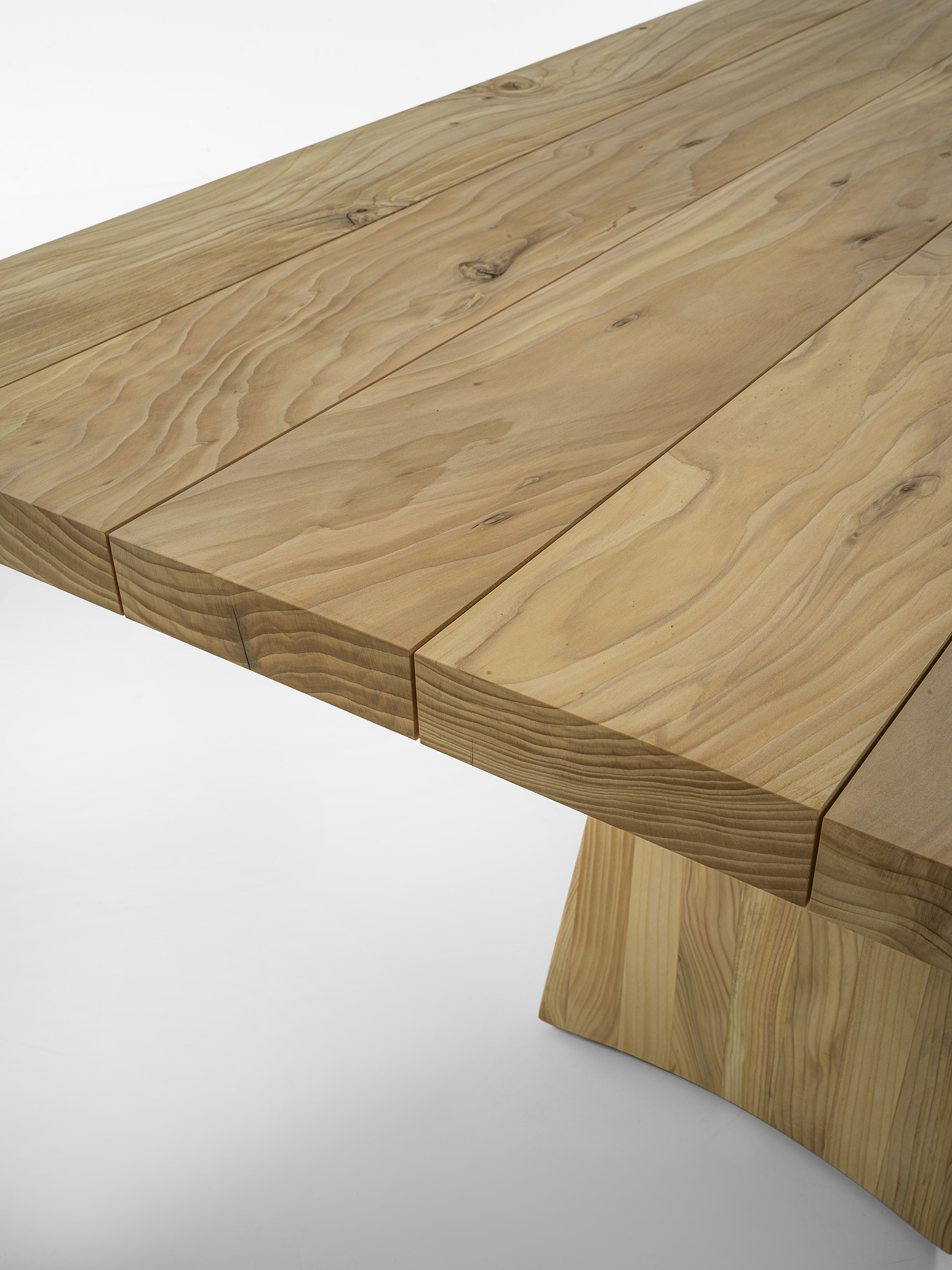 Versione per outdoor, in legno massello di cedro profumato del Libano. Top a liste accostate con bordi smussati. La forma del basamento nasce da un gioco di linee curve e rette che ne donano leggerezza.