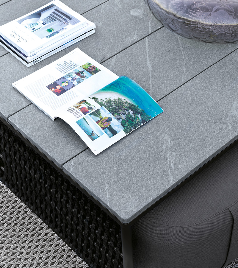 Outdoor square cocktail table in combination of satined black metal and black or light grey woven cordage. Top made by slats of treated "CARDOSO" natural stone with inserted Giorgio Collection logo.