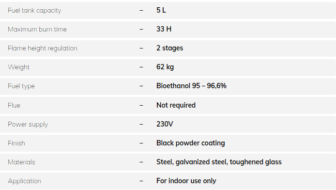 Ventfree and flueless bioethanol fireplace Scandi with its simple silhouette and stand-alone solution will undoubtedly become the center of attention in both simple and modern interiors. Scandi fireplace comes in black powder coating finish and the flames are protected with tempered glass panel. Handmade fireplace logs provide a realistic-looking accent making this scandinavian fireplace even more decorative. The Plug&Play solution ensures an intuitive and easy control of the fireplace.