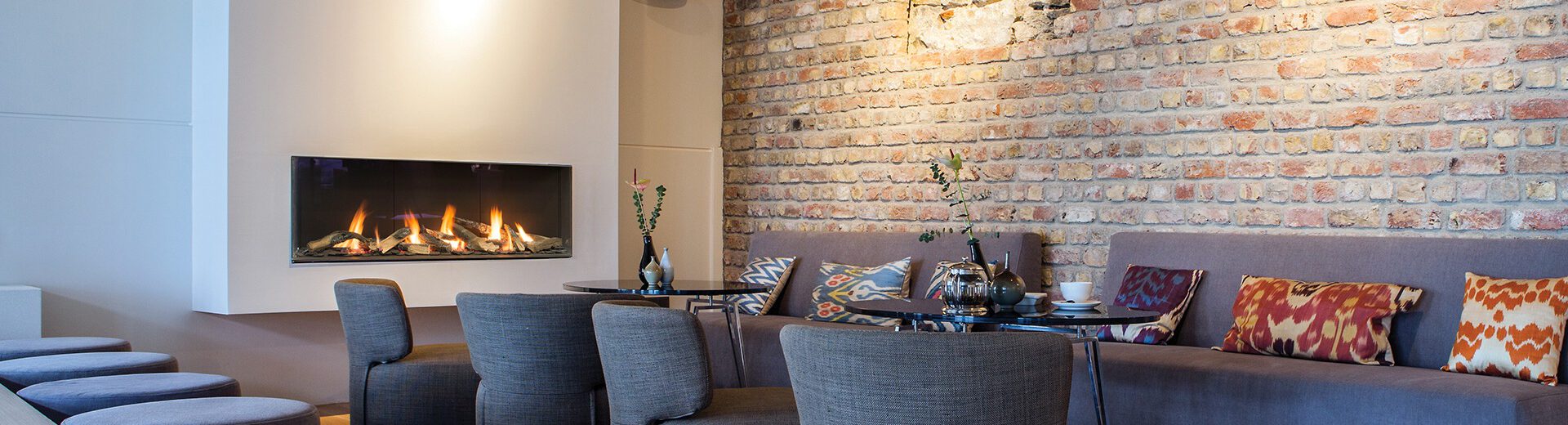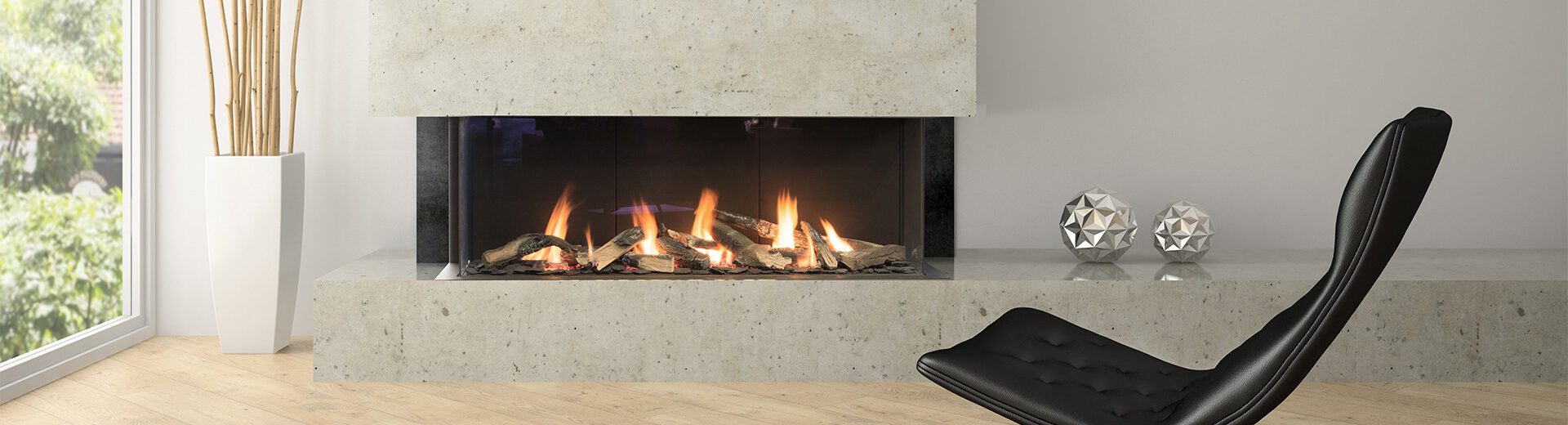 Valentino is a long gas fireplace with a three-section linear burner. It comes in two sizes, 1000 mm and 1300 mm, and is connected to a balanced flue. Shipped standard with antireflective glass panels and decorative logs, chips and black vermiculite. Valentino direct vent fireplace provides convenient control with a remote, smartphone and Smart Home Automation.