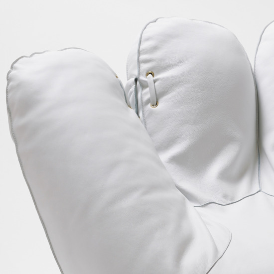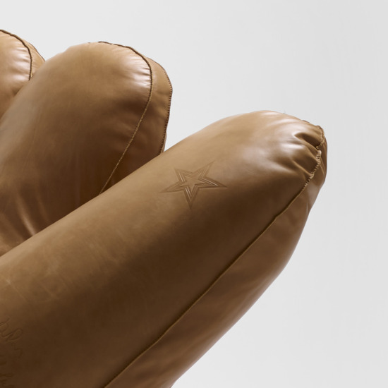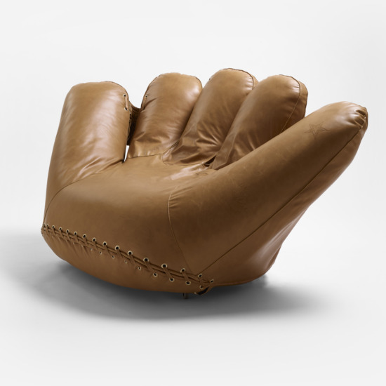 Joe is a big comfortable chair in the form of a giant baseball glove, mounted on invisible wheels. With this project the designers, inspired by the poetics of Pop Art, gave material form to their admiration for the legendary American baseball star Joe DiMaggio. With a courageous shift of scale, they transformed the glove into a welcoming place to sit, inserting a hyperrealist figure borrowed from the world of art into the domestic environment.