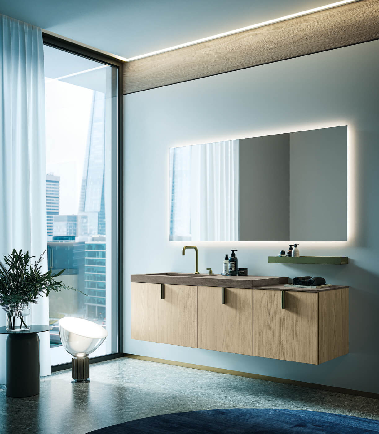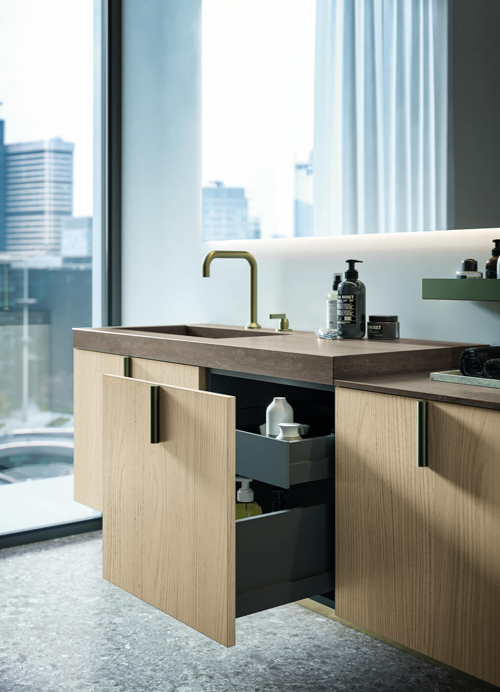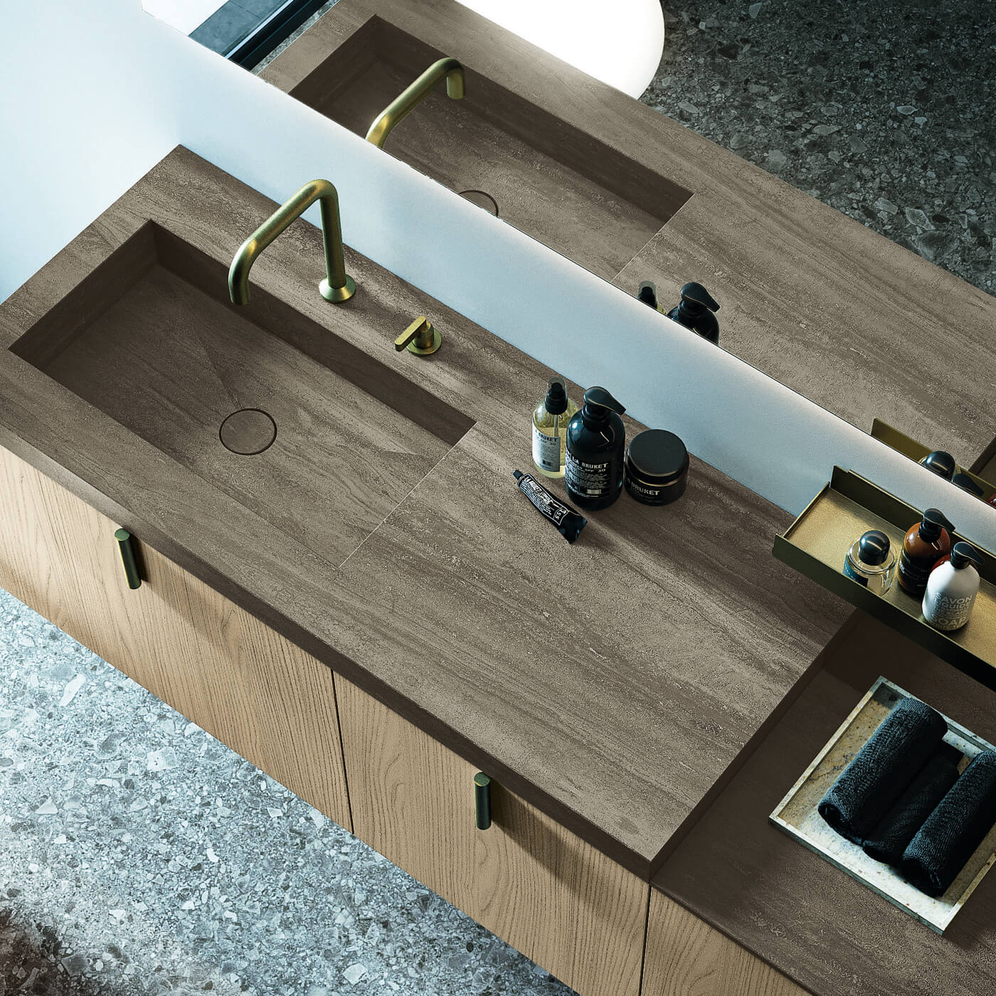 A choice of elegance, the modules with single front and internal drawer, guarantee exemplary capacity, without weighing down the aesthetics with additional handles. The low thickness porcelain stoneware box also features a finishing drain, a real touch of exclusivity to complete the proposal.