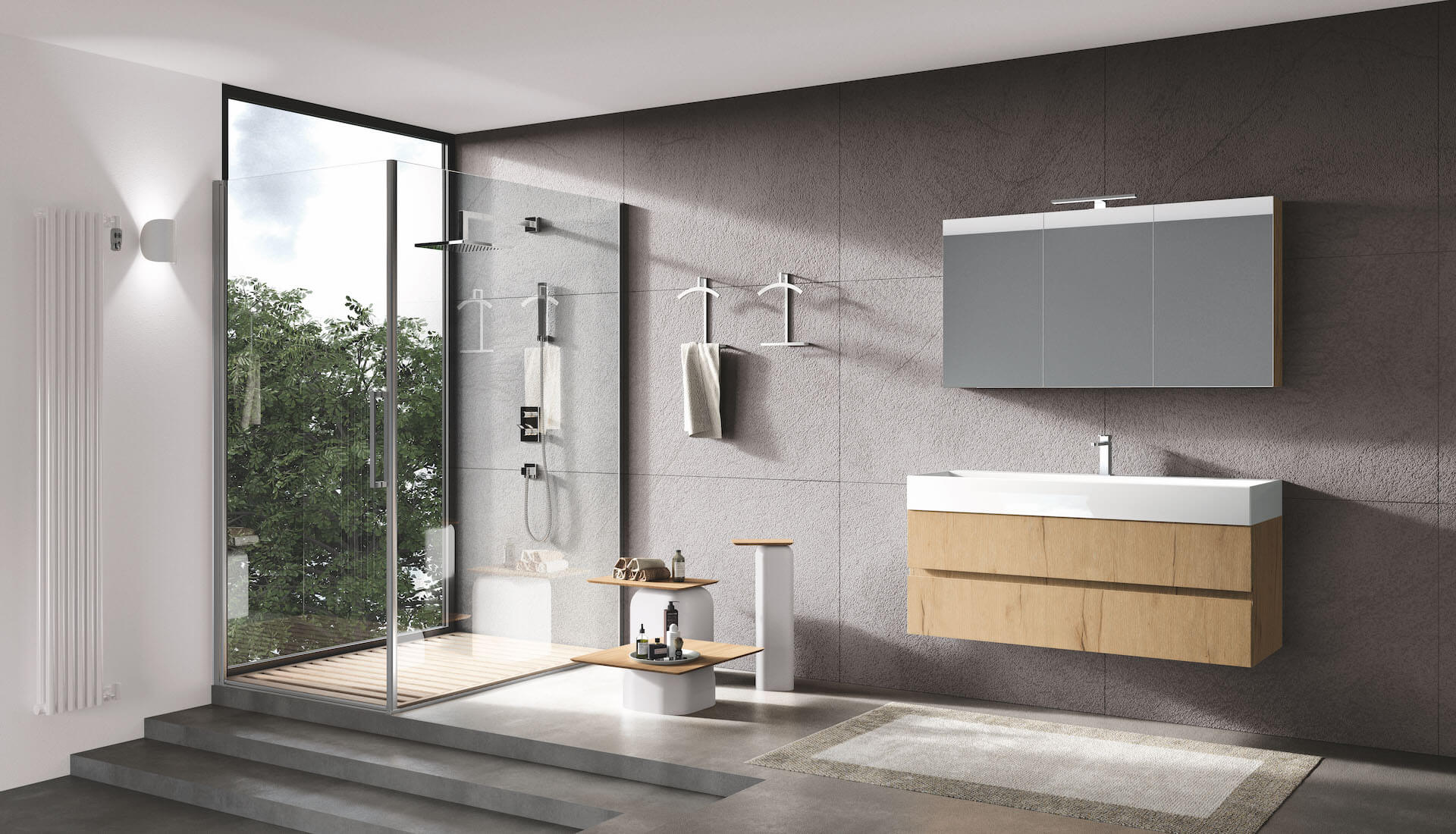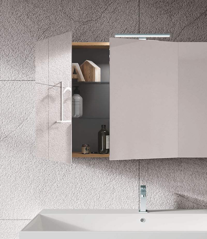 A composition where the search for storage space is pushed to the maximum, relying on the presence of the mirror container, with double surface mirror doors. The clean lines of the SLIM ceramic console are truly amazing, it also counts on a full width basin.In this detail we appreciate how much the single throat gives elegance to the whole. The container mirror, in addition to offering practical additional space, has doors with double surface mirroring, to be used as a triptych.